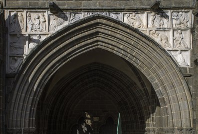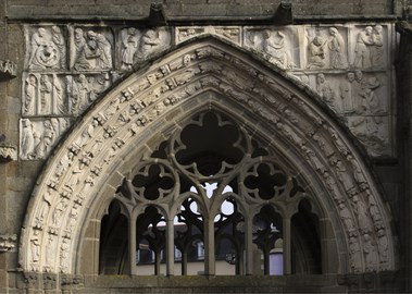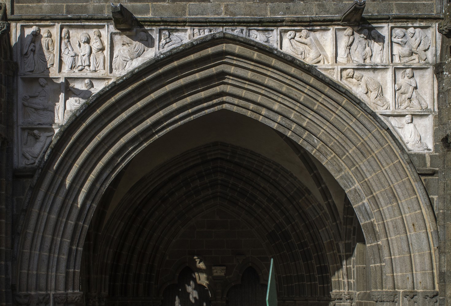 ► À l’extérieur, le Porche Saint-Magloire est l’élément le plus ouvragé, les trois arc-brisés de l’extension sont surmonté de bas reliefs racontant la vie du Christ. L’arc ouest est orné de 42 statuettes de saints.