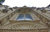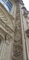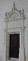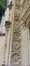 Le fronton cintré à coquille de la collégiale, voussures et ébrasures représentent Jésus et les apôtres ainsi que le thème de la mort.