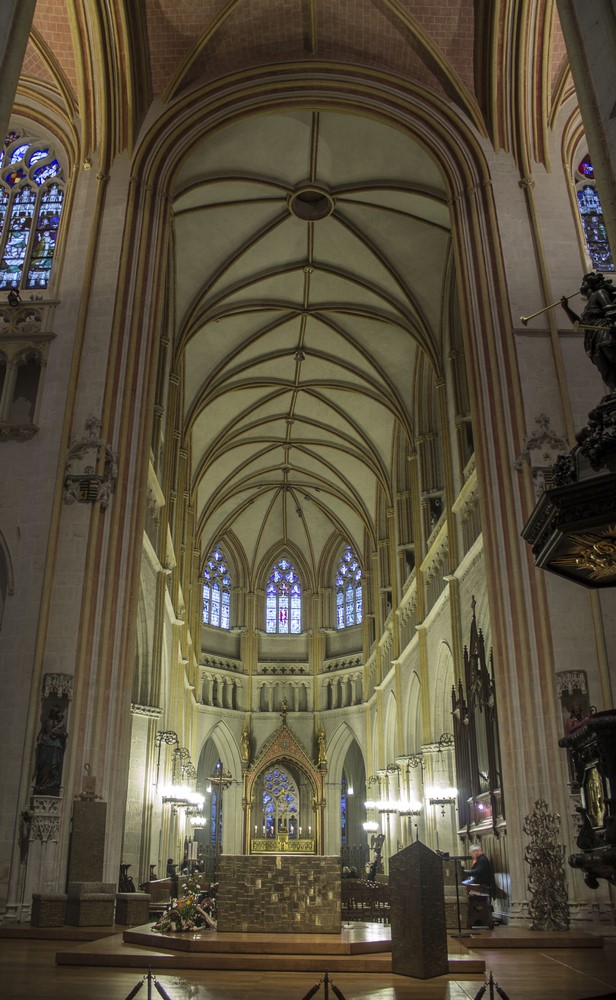 Chœur vu depuis la nef, il oblique légèrement sur la gauche, peut-être une symbolique en rapport avec l’inclinaison de la tête du Christ sur la croix.