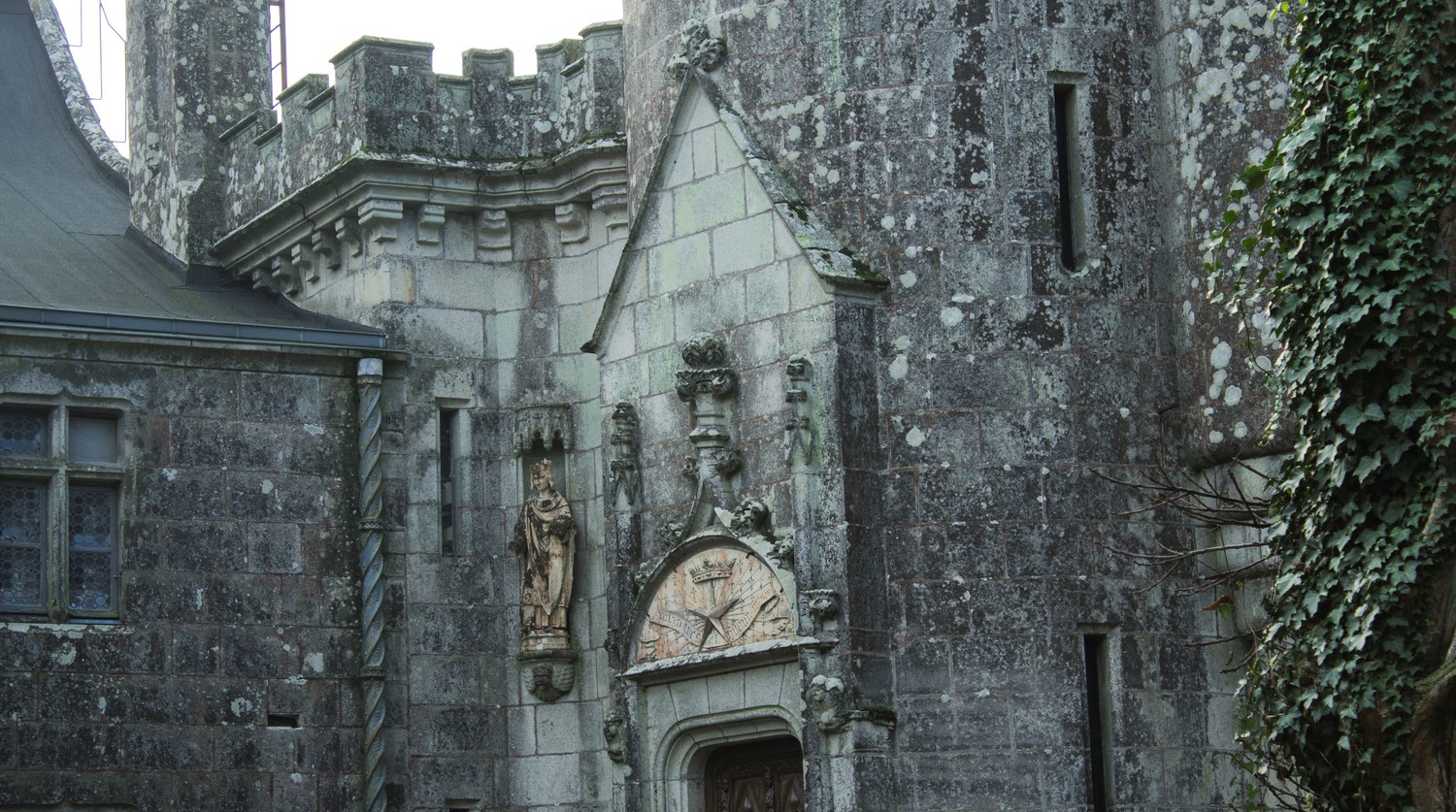 ► Le château, d’un style néogothique exécuté sous la direction de l’architecte Joseph Bigot, prend place sur un domaine plus ancien ou existait un modeste manoir du XIII de la famille des Kériollet. L’architecte s’inspira du Château de Blois (statue équestre en bas-relief de Louis XII), du château voisin de Rustephan, ou la Chapelle de la Trinité de Melgven. Des statues de Velléda, de Vercingétorix, d’Anne de Bretagne et de Charles VIII reposent dans le parc. La tourelle sur la droite du portail donnant sur la cour d’honneur est surmonté de l’Ange Gabriel sonnant la trompette. L’œuvre architecturale est très représentative de la démarche éclectique des architectes conservatistes de l’époque, mélangeant néo-gothique, néo-renaissance, le tout dans un aspect extravagant rappelant la vague romantique.
