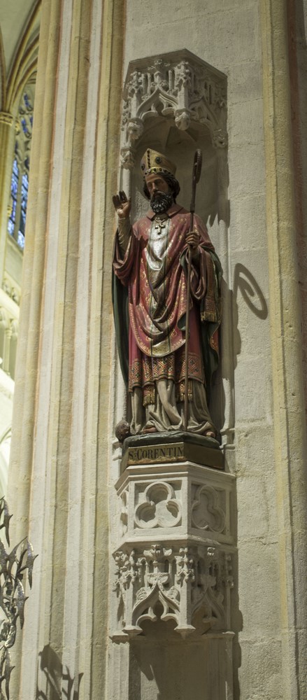 Façade occidentale avec ses à flèches restaurées aux XIX, encadrées par elles, une statue du roi Gradlon.