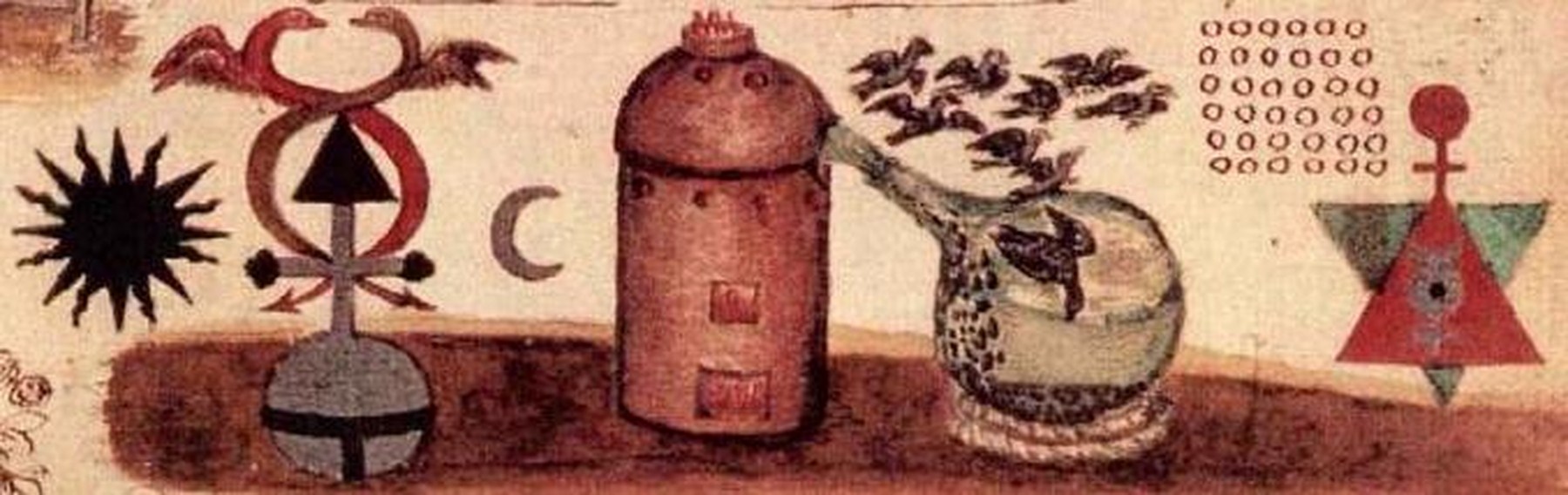 Adonc fais iceux ressusciter et régénérer en cuisant 40 jours, et ne t’ennuie mie ; lors se feront mutations diverses c’est à savoir couleur noire, cendrée, verte, blanche, orangée, et en terme fini, un rouge comme sang ou pavot cramoisi. N’aie cure que d’icelle dernière, car d’icelle le vrai soufre est fini, et tu possèdes la poudre d’alchimie, ne te dirai au juste le terme, car icelui y dure selon l’engin de l’ouvrier, mais ne pourras faillir en besognant ce que je te baille.