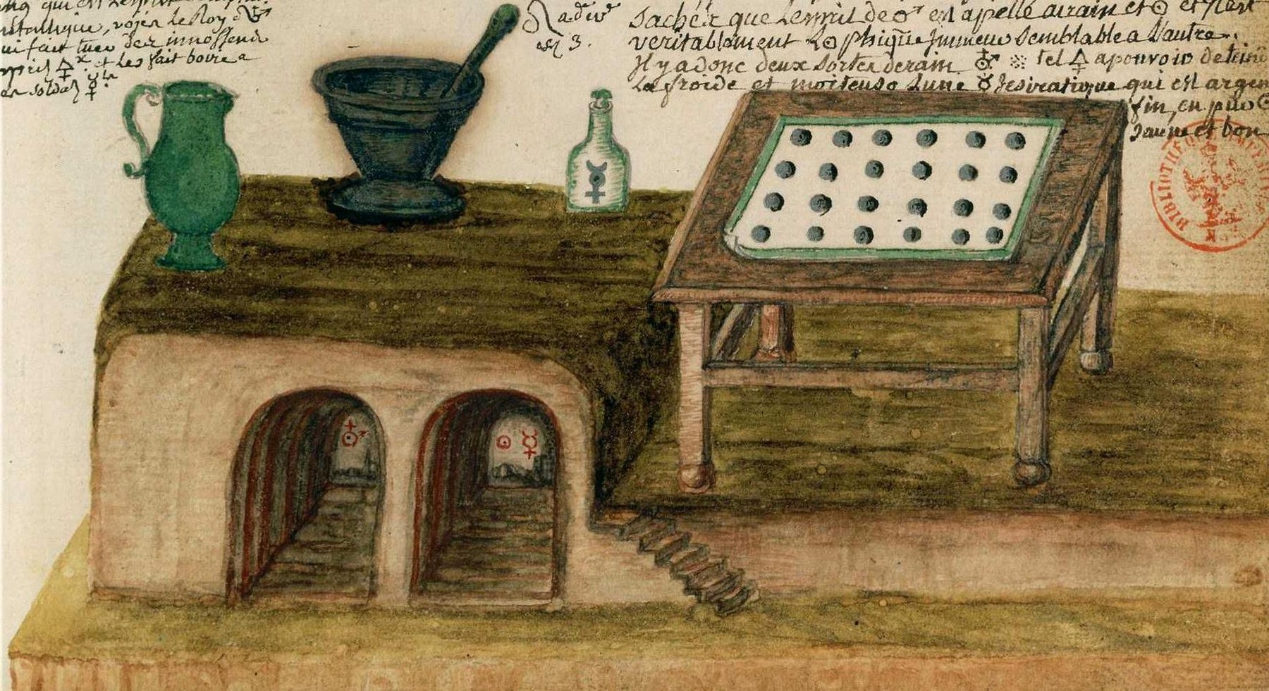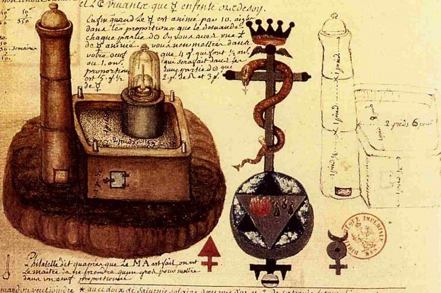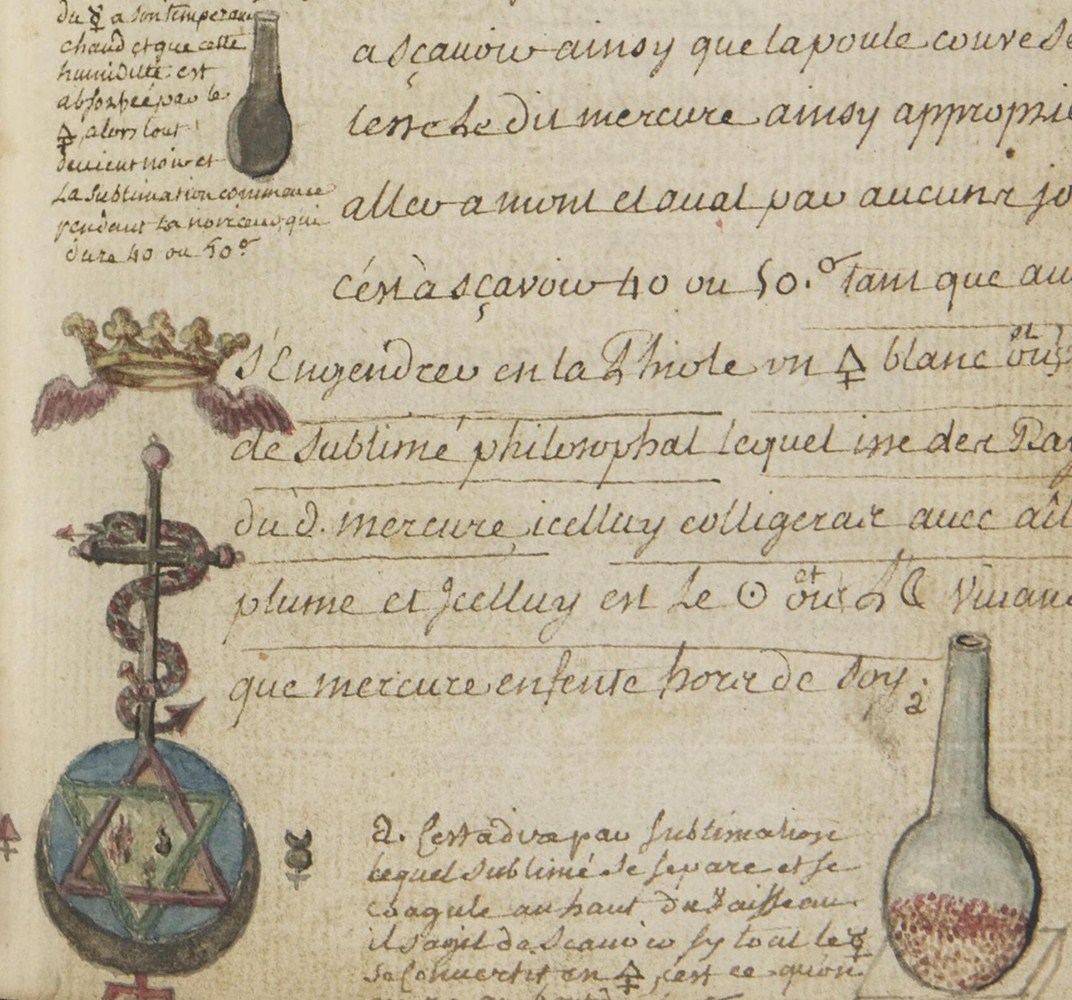 Si tu as désir d’œuvrer par autre chemin, prends or fin trois parties en poudre fine ou en feuillets moult bien déliés, fais d’icelui ainsi que pâte avec 7 parts de ton mercure philosophal qui est notre lune ; mets iceux en fiole ovale, au fourneau, le vaisseau moult bien obtus et engencé à feu moult fort, c’est à savoir comme à tenir feu de plomb sans s’asseoir et se coaguler car lors est trouvé engin droit de régime de feu, et ton mercure qui est vent philosophal monte et dévale en bas sur le corps de l’or que mange petit a petit et que porte en son ventre.