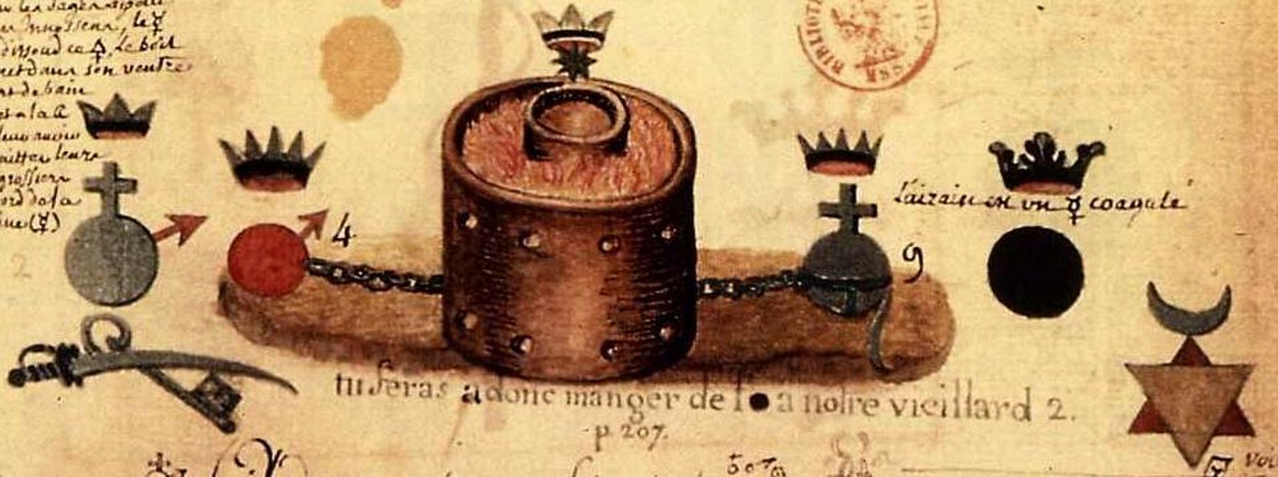 Note que faut œuvrer en tout selon poids que te dis car sans cela ne laboureras à ton profit mais a ton détriment, recorde de ce, voilà l’engin trouve. Scelle donc ledit secret car icelui est tout et ne l’écris oncques sur papier ni autre chose qui se puisse voir écrit car serions cause du dommage de l’universalité mondaine. Or moi te le baille sous le sigille du secret de la conscience en amour qu’ai envers toi. Avise prendre X parties d’or à savoir fin net et purgé 9, 10 a 11 reprises par le loup vorace seul, en après 11 parties de Saturnie régale, fais-les fuser en creuset ; adonc icelle fuse, jette dedans alors X d’or fin, fais fuser les deux et remueras avec un charbon enflambé, adonc ton Or sera appert un petit peu ; jette icelui en un marbre, pilé en poudre avec 12 de vif argent.