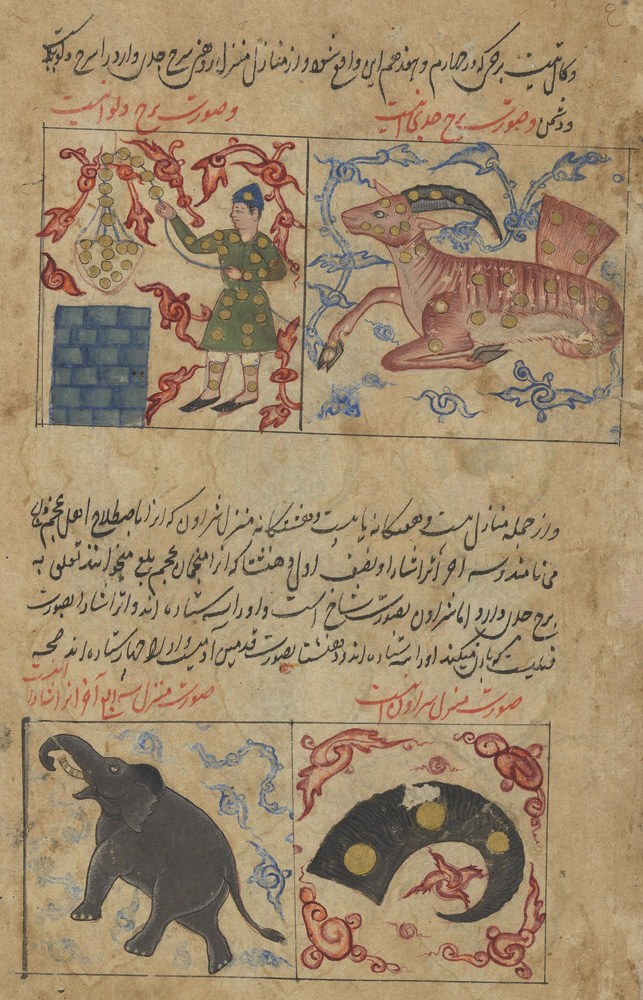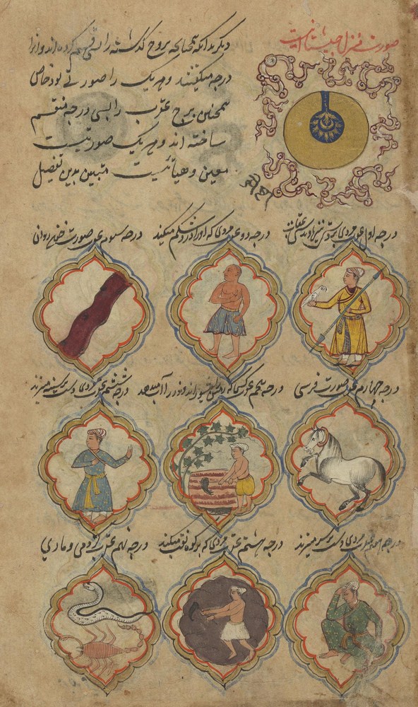 ► Ce livre d’astrologie፧ richement illustré rédigé en nasta’liq brisé contient aussi des passages sur la talismanie ainsi qu’une petite section sur la philosophie et les mathématiques.
