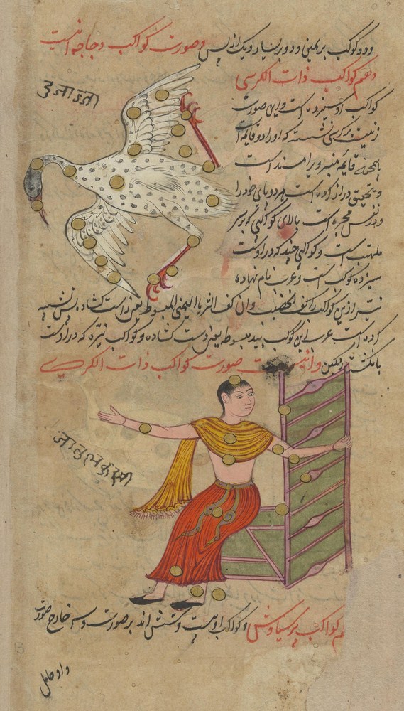 ■ Étant donné le grand nombre d’illustrations, nous en avons seulement sélectionné une portion. Nous avons gardé toutes les figurations des constellations. Également, du fait de leur peu d’intérêt sans le texte, nous n’avons pas rapporté tous les thèmes, tableaux et tracés géométriques qui étaient présentés dans le ms.. Pour voir tout le matériel que nous n’avons pas rapporté ici, VSO.