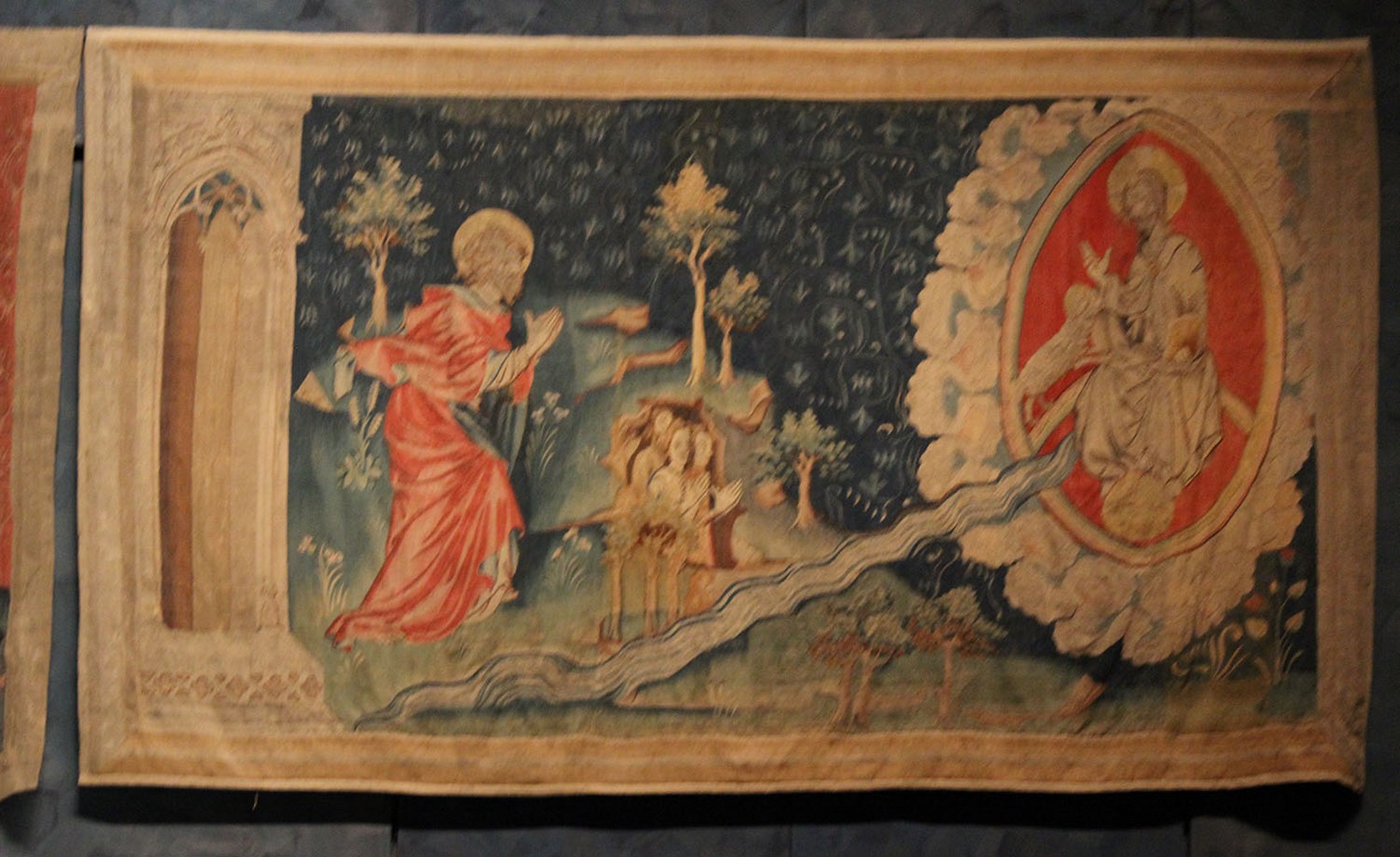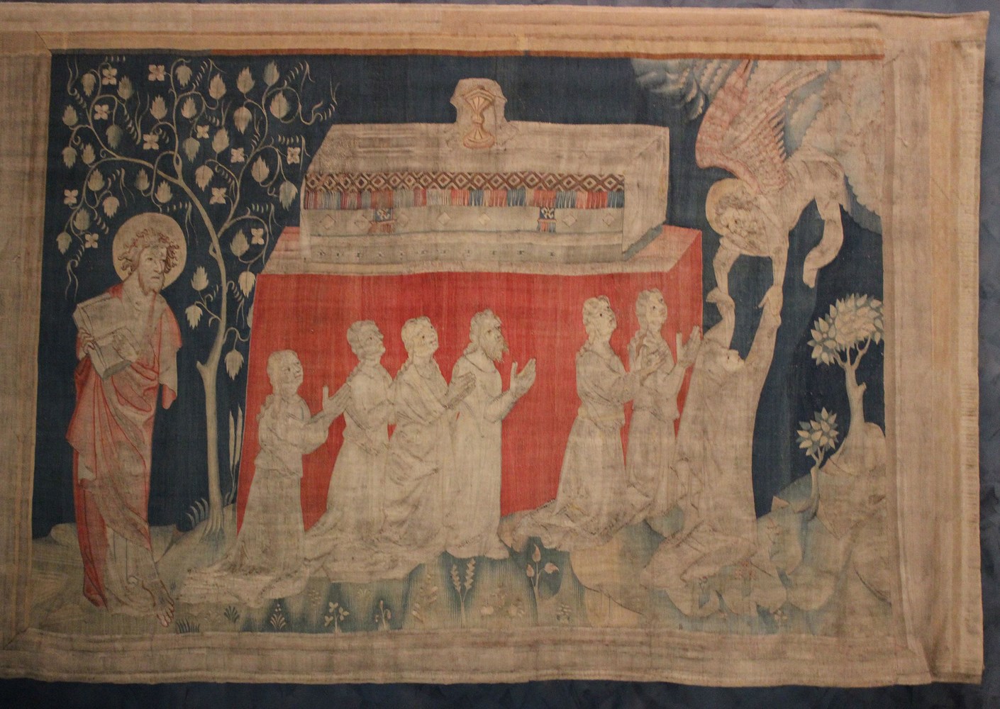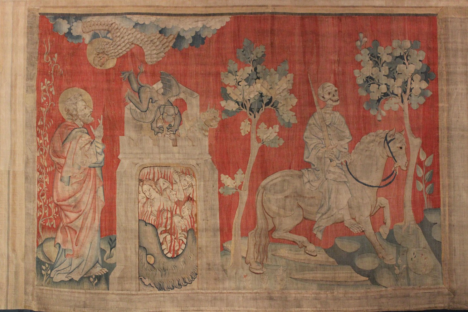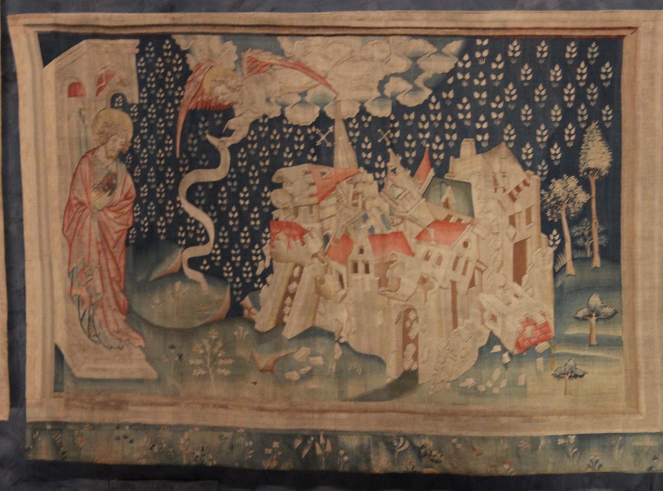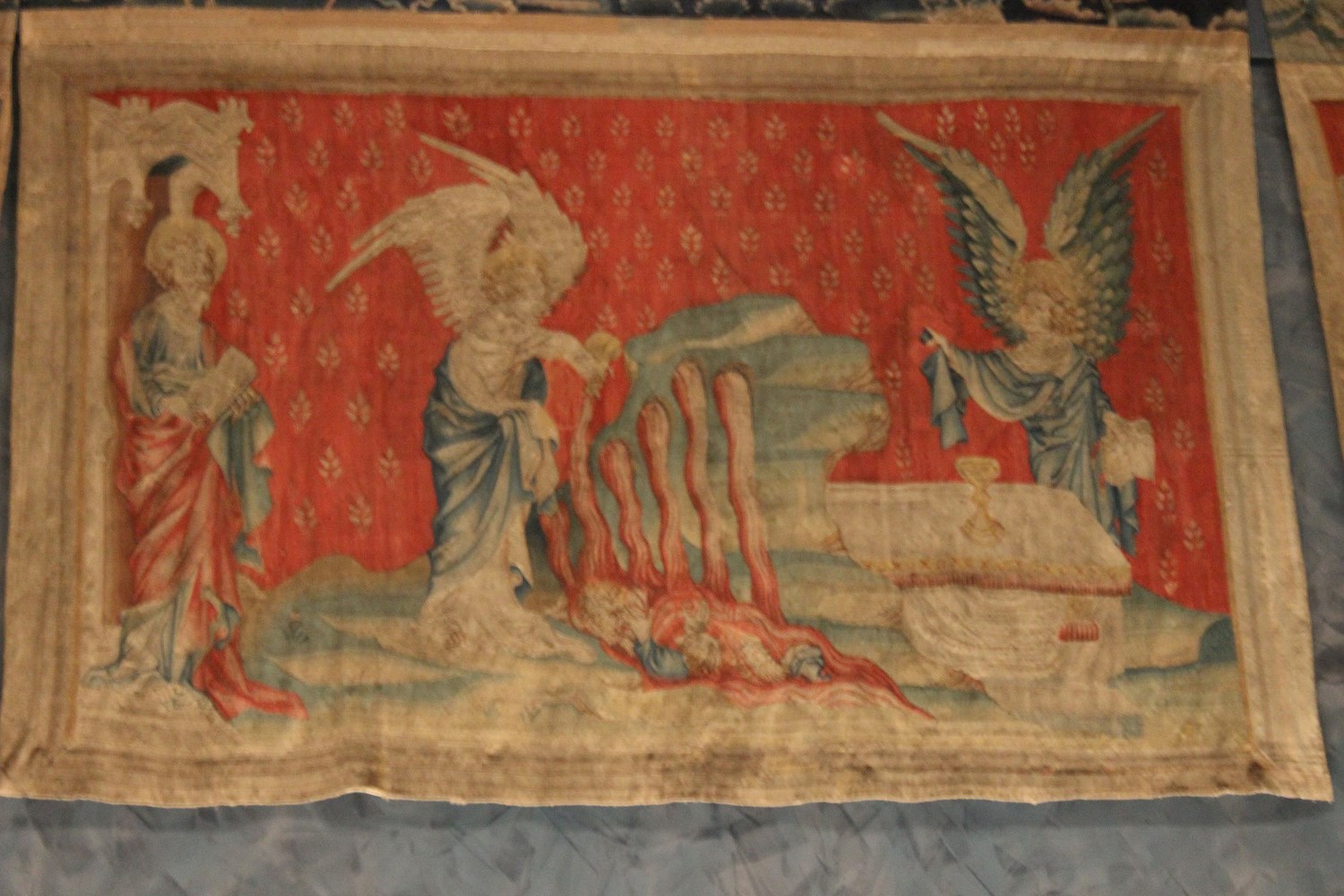 ► Commandée initialement ≈ en 1375 par le duc Louis Ier d’Anjou, elle est terminée en 1382. Au XV, son descendant, René d’Anjou, en fait don à la Cathédrale Saint-Maurice d’Angers, puis à partir de la révolution, elle est négligée, fortement endommagée et débitée. Elle est ensuite restaurée au m.XIX puis exposée au Château d’Angers. On aura néanmoins irrémédiablement perdu un peu moins de 40 m de tapisserie sur les 140 m totaux. Nous disposons en effet de 71 tableaux sur les 90 dont on est certain qu’ils eurent existé, pour une surface totale de 775m2.