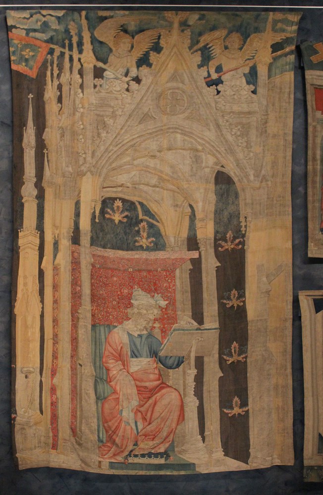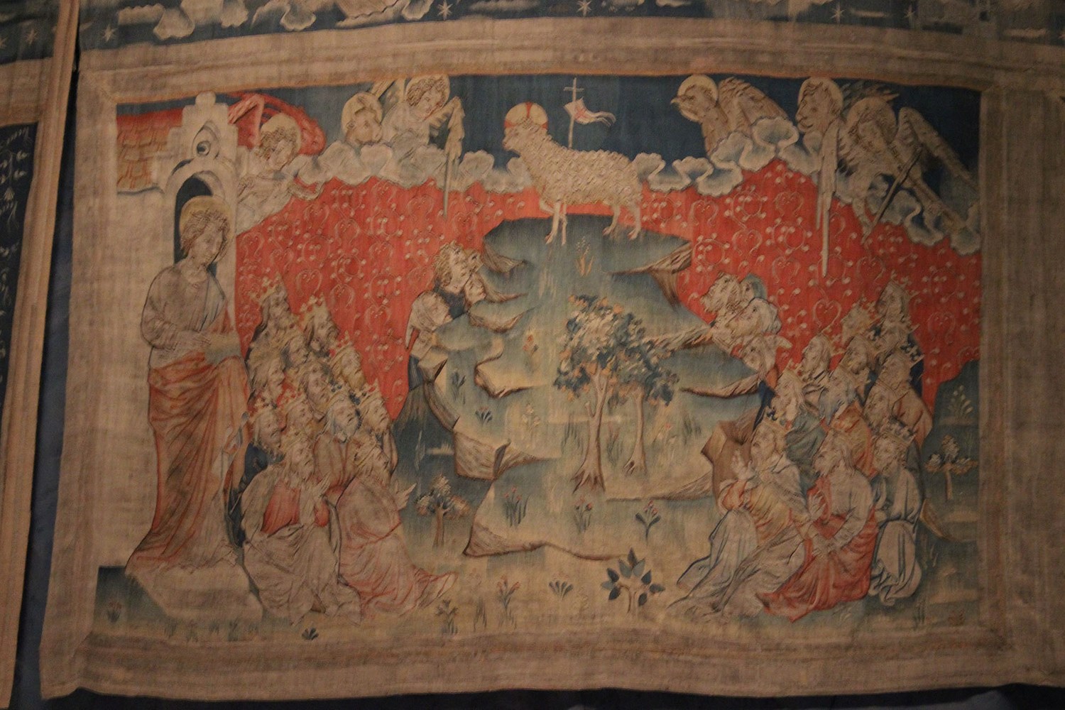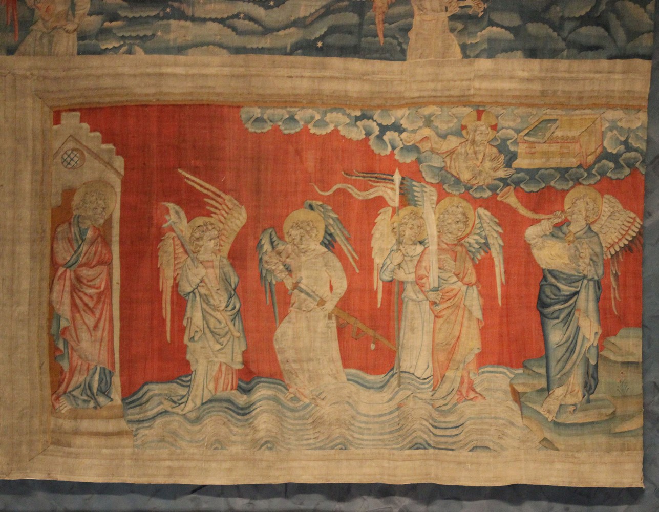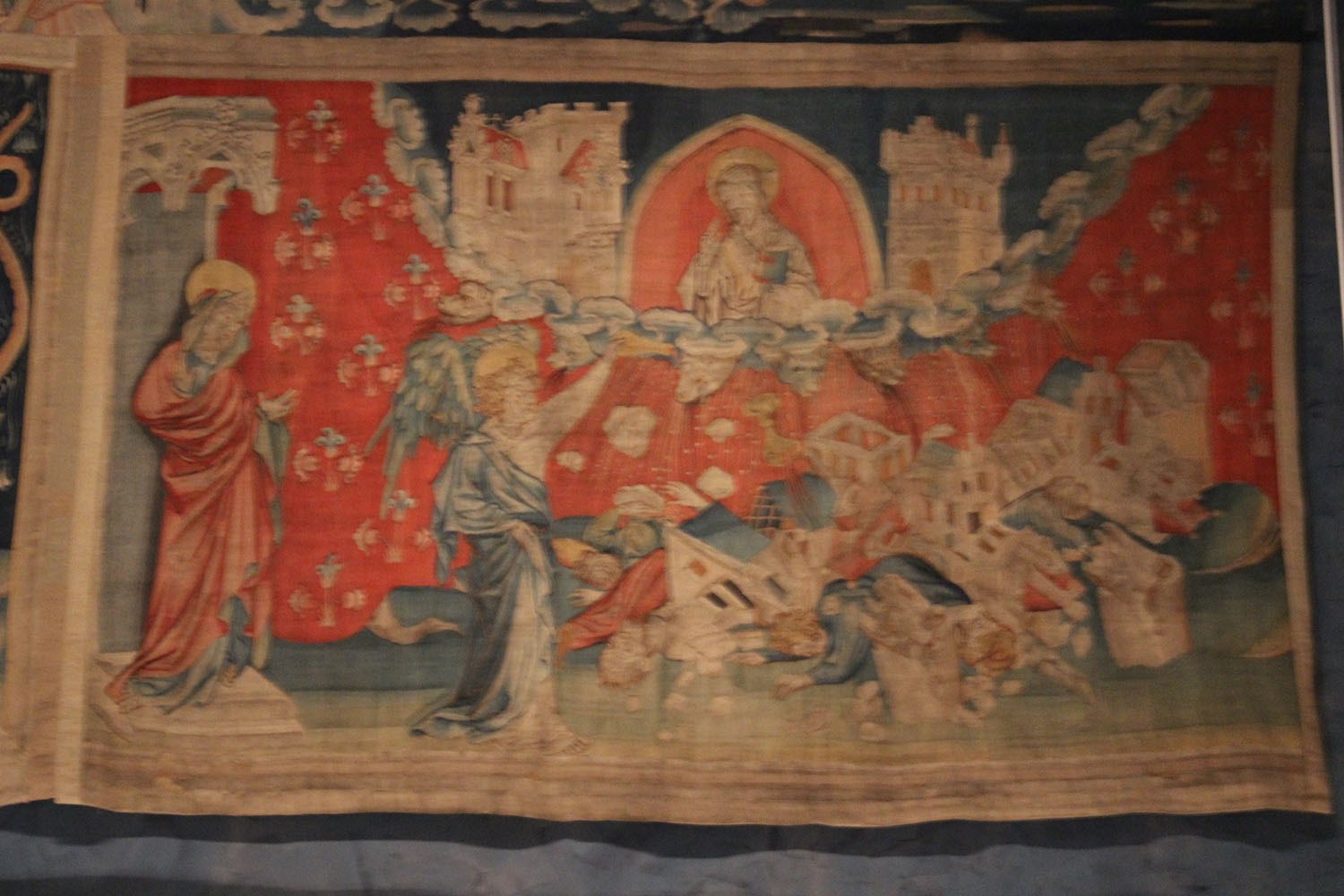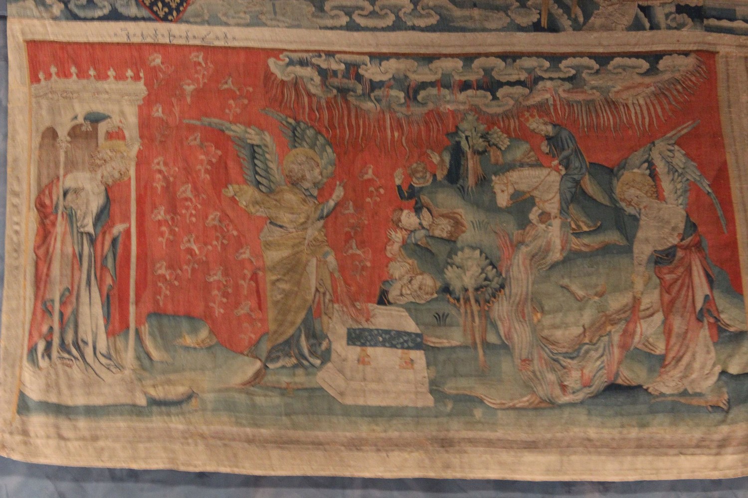 ► Probablement inspirée des enluminures des ouvrages de l’époque, la tenture, qui présente diverse scènes de l’Apocalypse de Jean, est composée de six tapisseries réversibles présentant 15 tableaux avec une scène introductive. Les tableaux, dont le fond est alternativement bleu et rouge, sont bordés de motifs représentant le ciel et la terre. Il s’agit de la plus grande tenture au monde encore conservée : à l’origine, on suppose qu’elle couvrait 850 m2 de surface et que le texte de l’Apocalypse était tissé sous chaque scène. Certains analystes supposent même qu’une septième tapisserie faisait à l’origine parti de l’ensemble.