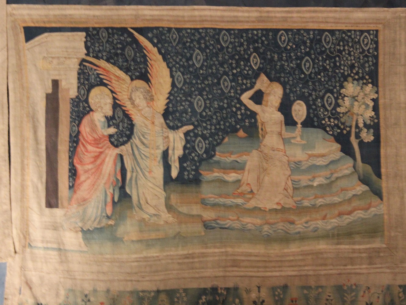 ■ Nous avons disposé la tenture de façon à faire rendre compte de l’ensemble et avons intercalé des espaces vides afin que l’on puisse mesurer l’œuvre dans sa totalité. Le rangement - certainement provisoire et visible sur les photos d’ensemble - qui avait alors cours au musée lors de notre passage ne prenait pas en compte les tapisseries manquantes et mélangeait certains tableaux sur les deux derniers ensembles : les noms associés aux photographies sont cependant corrects.