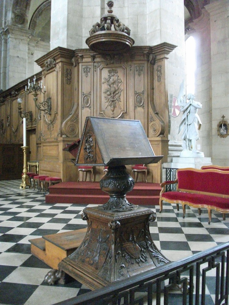 Partie droite du chœur décoré de boiseries de 1723 dessinées par Germain Boffrand avec au premier plan, un lutrin, puis non loin, le prêchoir et une statue de Jeanne d’Arc.
