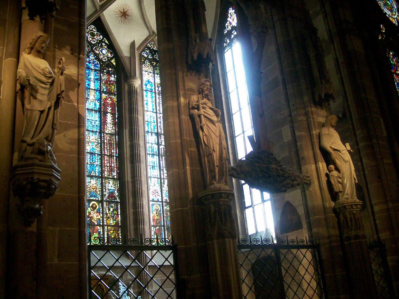 Dans le bras nord du transept, des fonts baptismaux heptagonaux flamboyants de Jodoque Dotzinger sculptés en 1453.