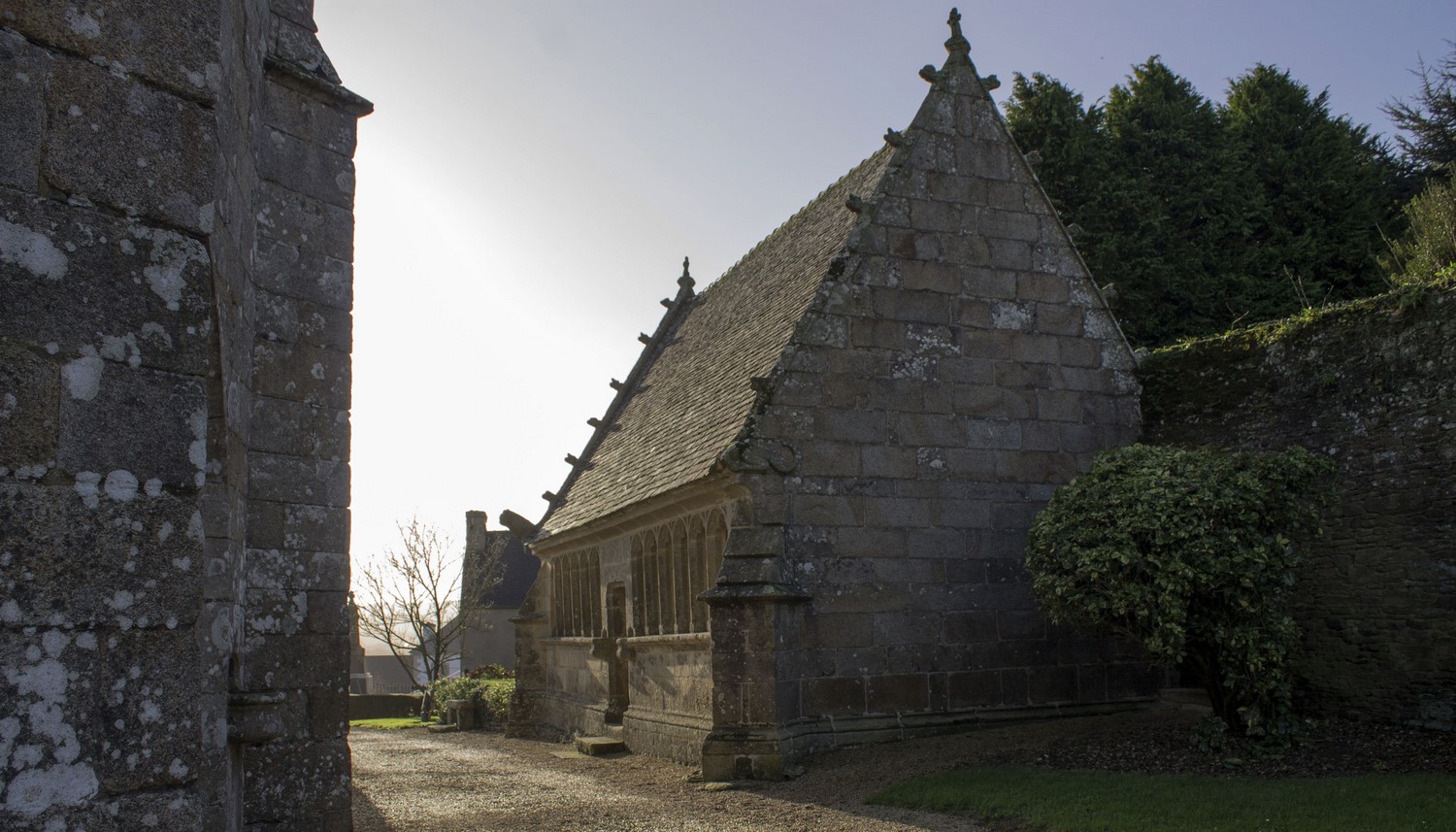 Chapelle funéraire de 1577 ornée de sablières en bois sculptées.