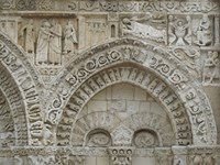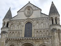 Façade romane poitevine où l’on voit la troisième élévation፧ de la façade : un fronton pourvu d’une mandorle garnie d’un Christ en gloire entouré par le tétramorphe.