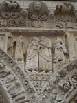 Détail des sculptures de la première et seconde élévation፧ de la façade, les galeries d’arcades nichent à la première des statues des apôtres et à la seconde, les quatre Évangélistes et ℙ les évêques Hilaire et Martin.