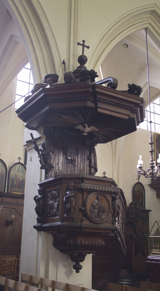 Chaire de vérité Louis XIV du XVIII représentant en médaillons sur sa cuve saint Nicolas avec les trois enfants et l’œil de Dieu.