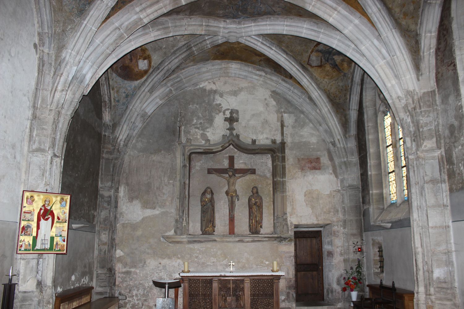 La chapelle axiale avec des statues de la Vierge et de saint Joseph.
