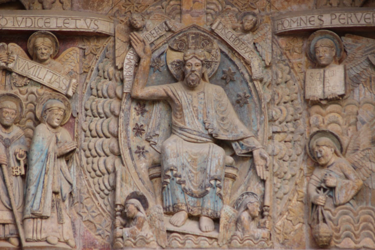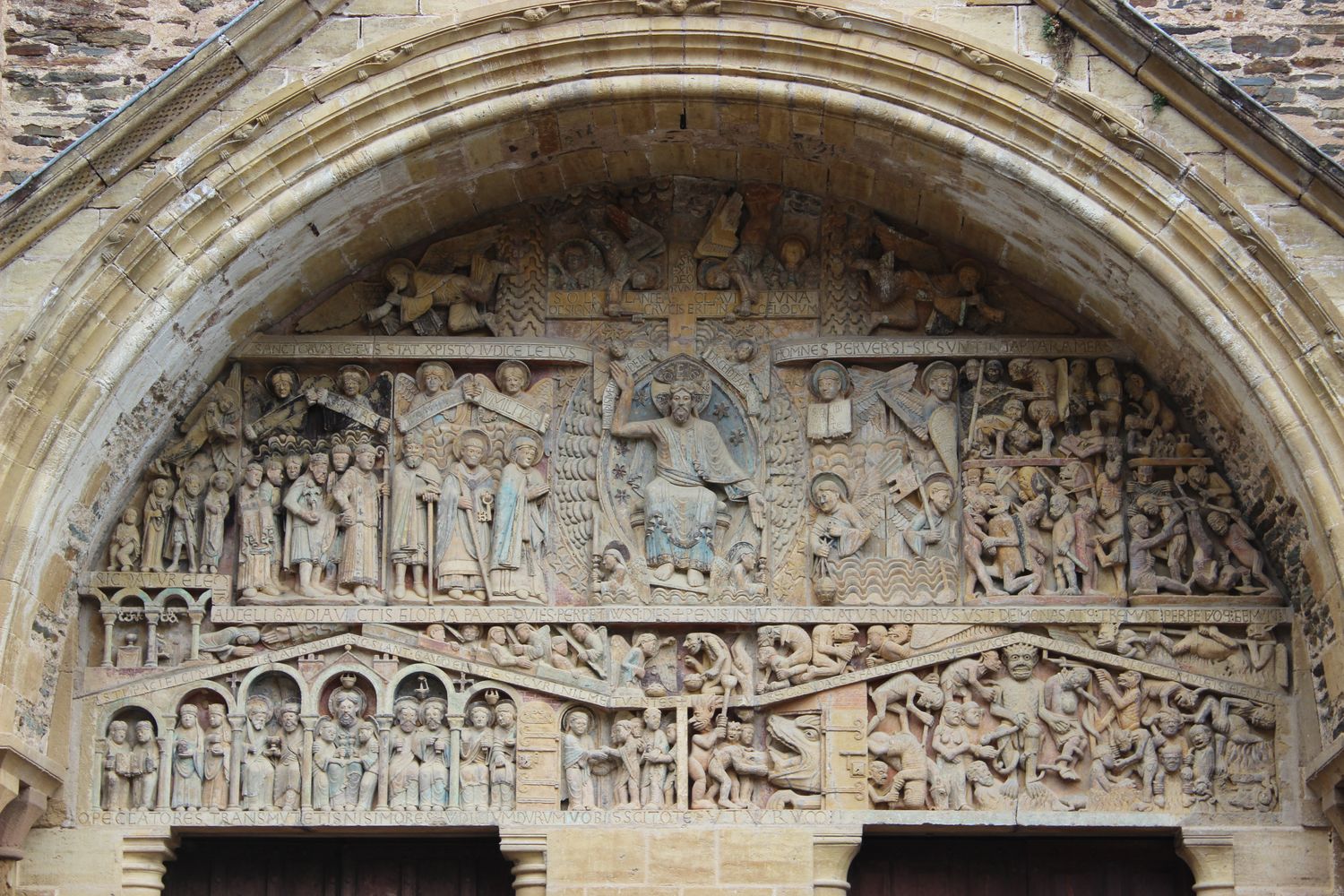 Au centre du registre médian, le Christ en majesté, aurifié d’une mandorle byzantine et soutenu par deux anges céroféraires, sépare les élus des damnés.