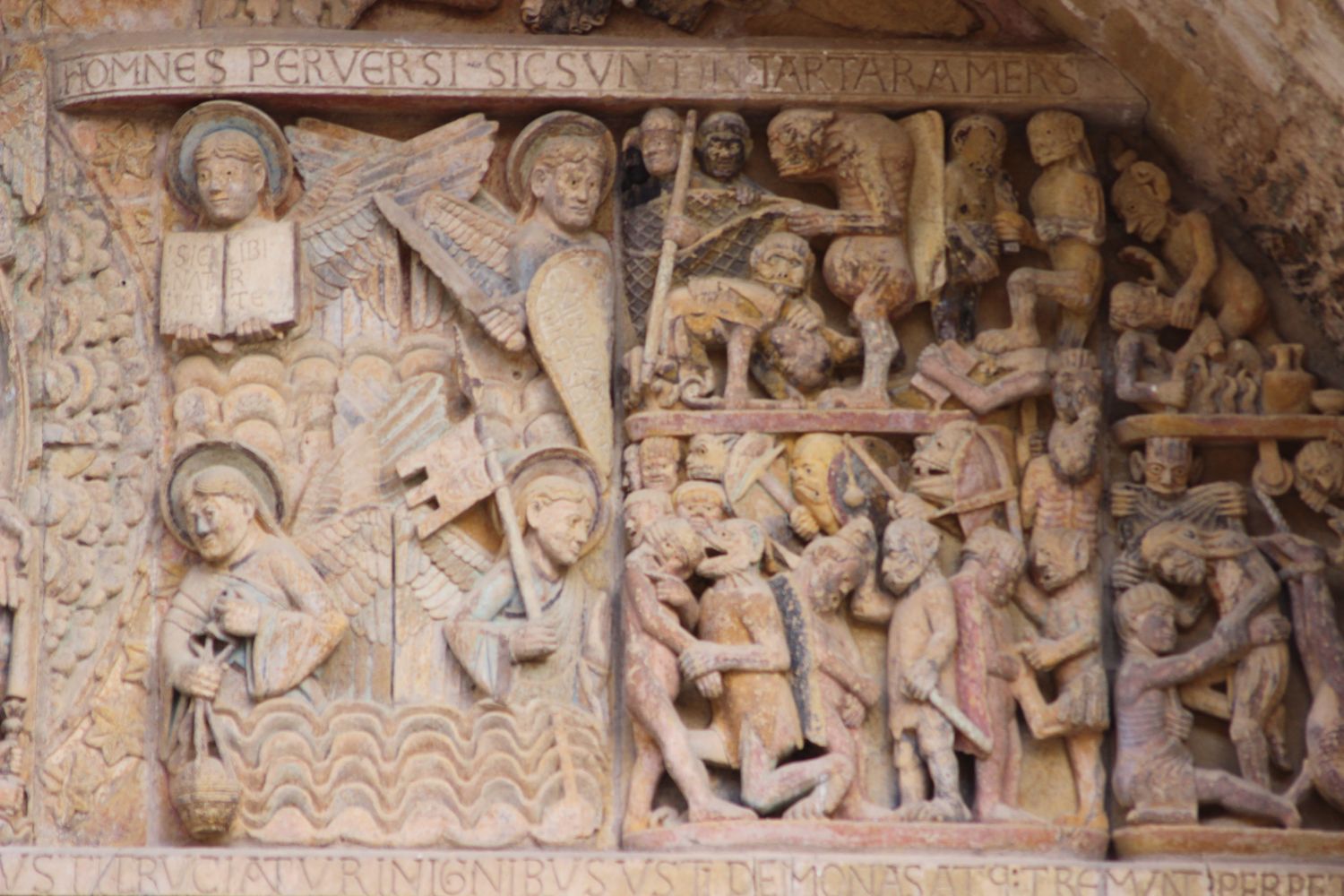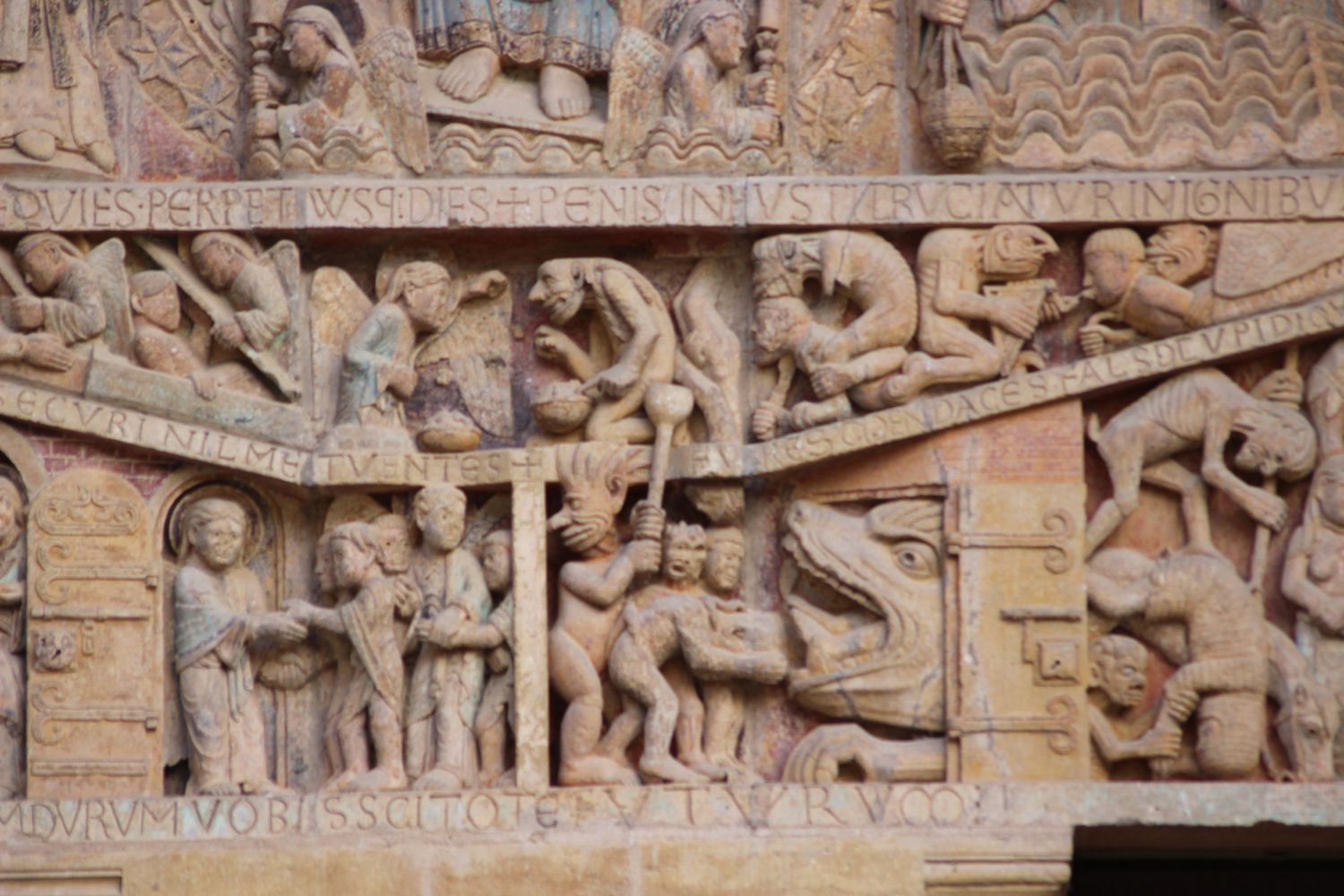 Le registre inférieur montre le purgatoire avec les âmes des justes d’un coté, accueillies au paradis et les âmes damnées, précipitées en enfer par la bouche de Léviathan. Suit une cloison séparant le paradis du purgatoire. Dans le bandeau supérieur, on voit Saint-Michel effectuant la pesée des âmes et le Diable tentant d’influencer le résultat en appuyant sur un plateau.