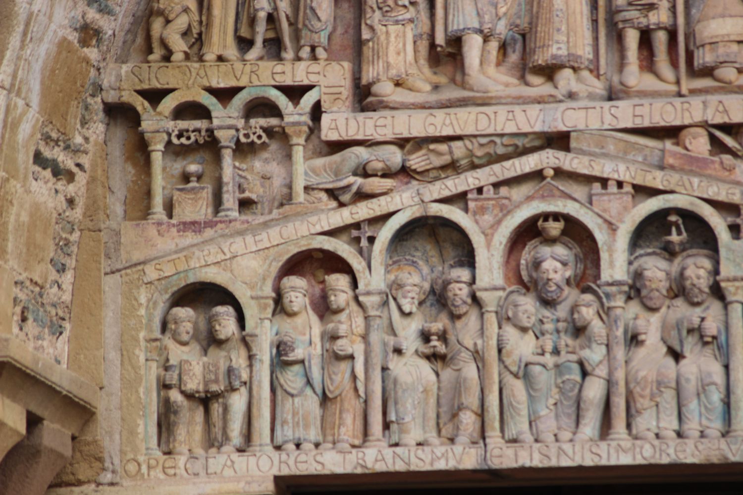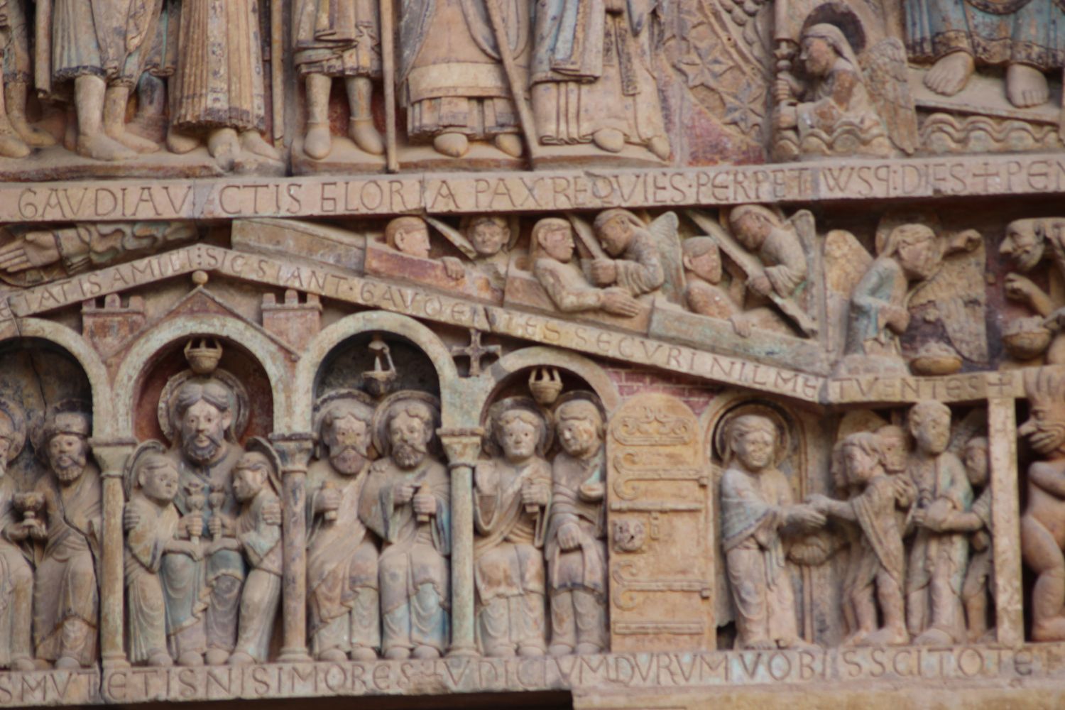 Le registre inférieur montre le paradis : deux vierges sages, deux saintes, deux saints et Abraham et deux élus. Dans le bandeau supérieur, Sainte Foy intercède pour les pêcheurs auprès de Dieu dont on voit la main. À sa gauche, les menottes des prisonniers, qu’en sainte dédiée, elle a libéré sont suspendus dans une figuration de l’abbatiale.