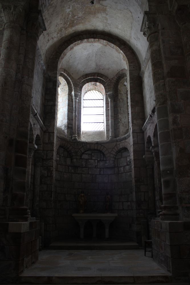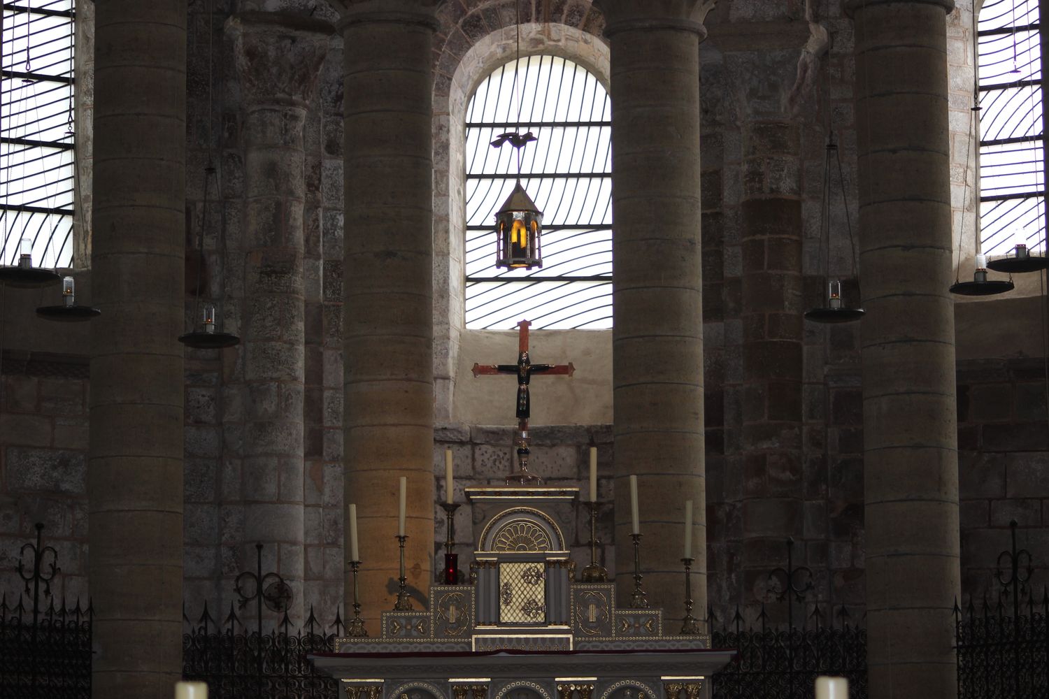 Maître-autel. On voit également en verrière, les œuvres abstraites de Pierre Soulages posées dans les années 90. En arrière-plan, on aperçoit les grille en fer forgé f.XII dont la légende assure qu’ils furent forgés des fers des prisonniers délivrés par Sainte Foy.