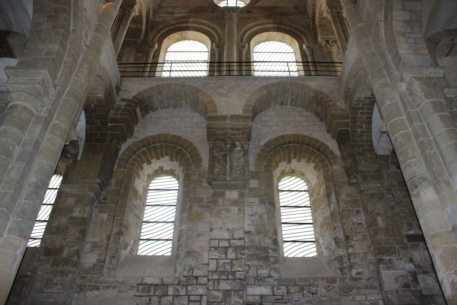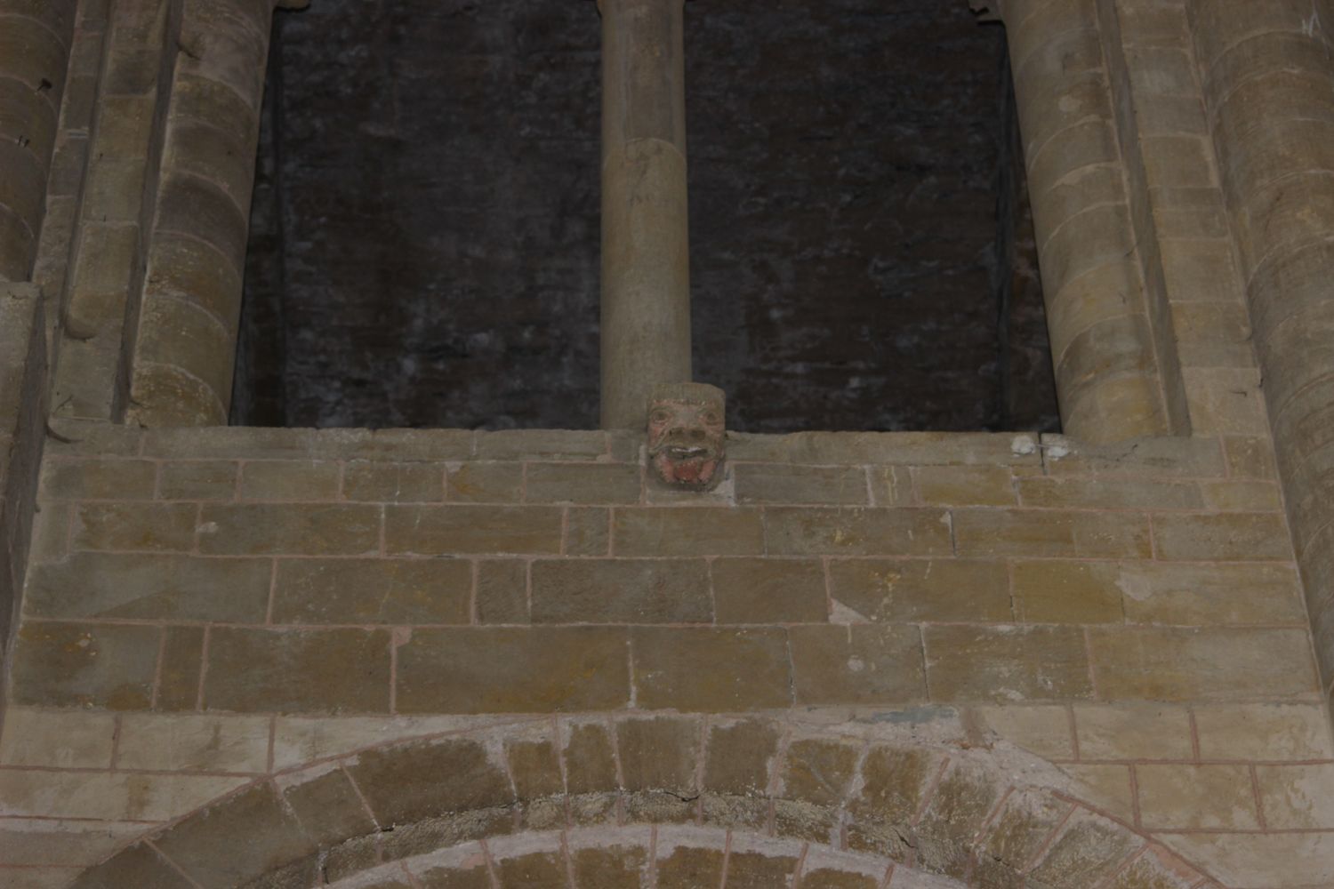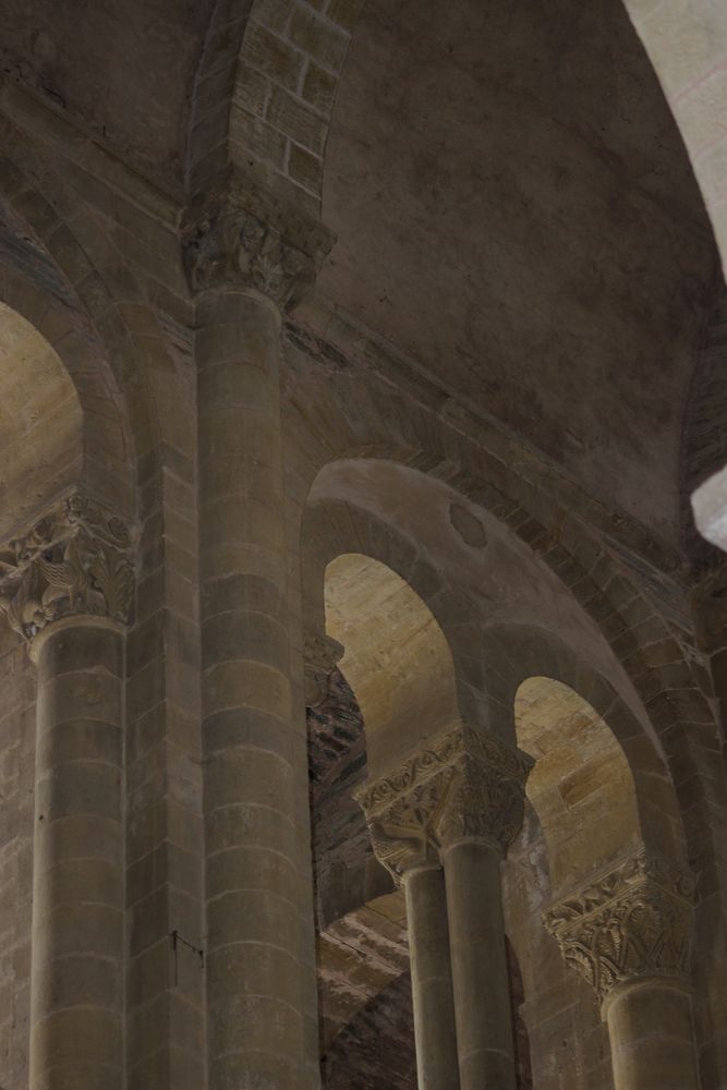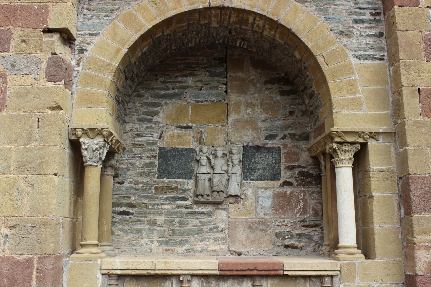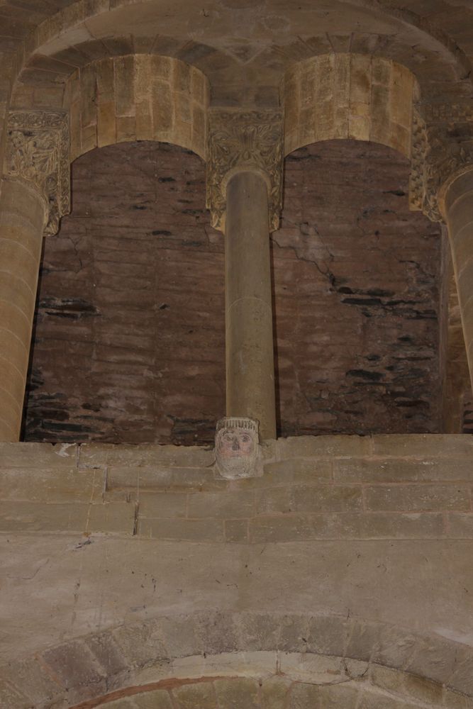 Une des niches du coté sud de l’abbatiale propose des colonnettes aux chapiteaux sculptés supportant un arc cintré.