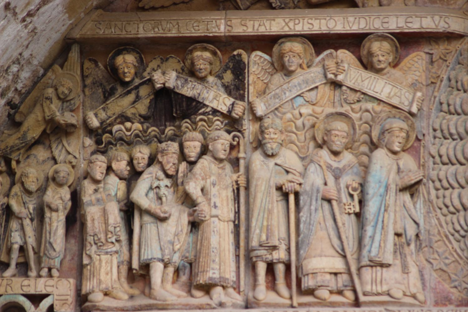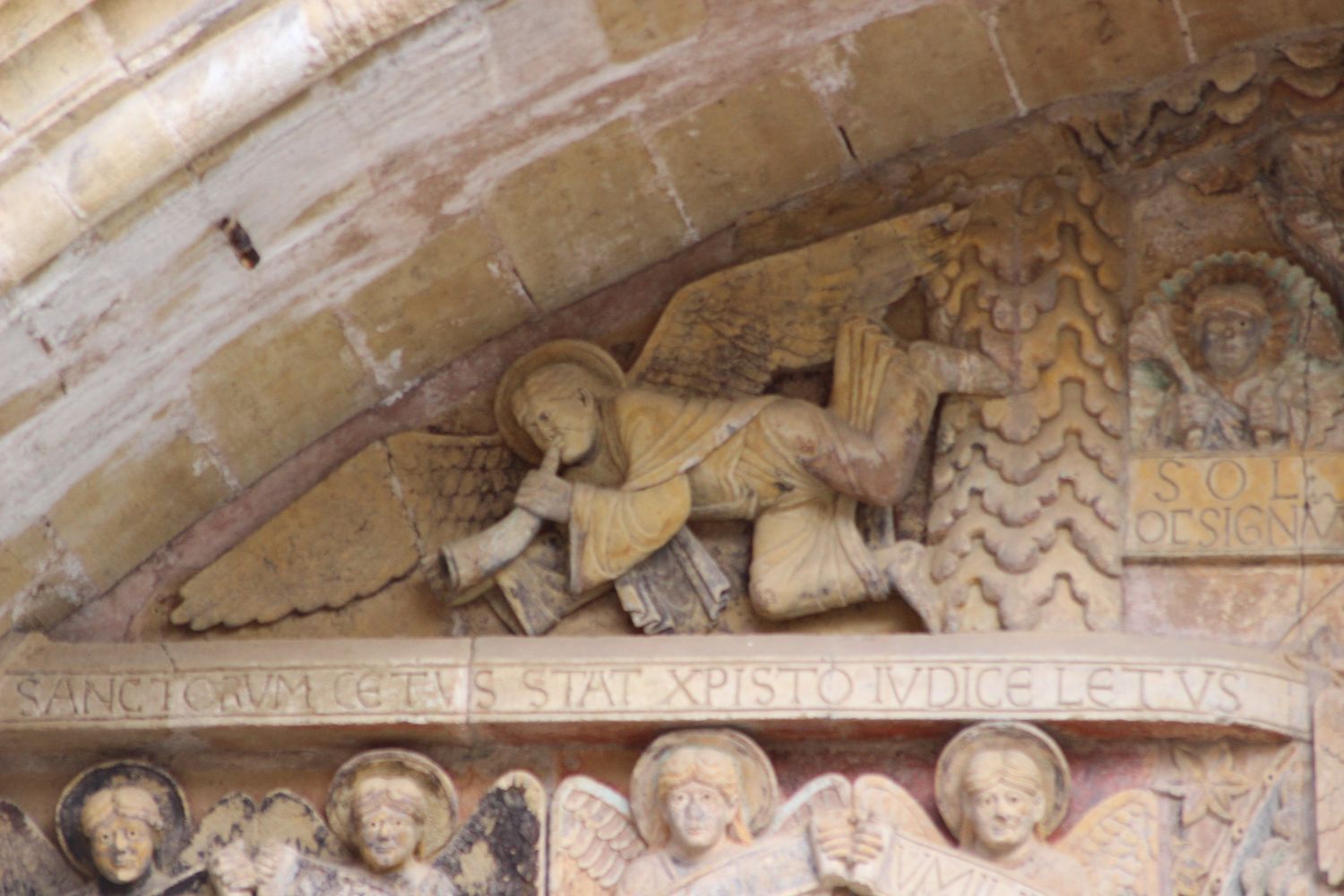 Le remarquable Tympan du Salut dédié au Jugement dernier, chef-d’œuvre roman. Datant du XII, disposant de 124 personnages (des anges curieux sont aux voussures), il était originellement à l’intérieur de l’abbatiale mais fut déplacé en façade au XV. On trouve inscrit sur les phylactères en vers léonins :