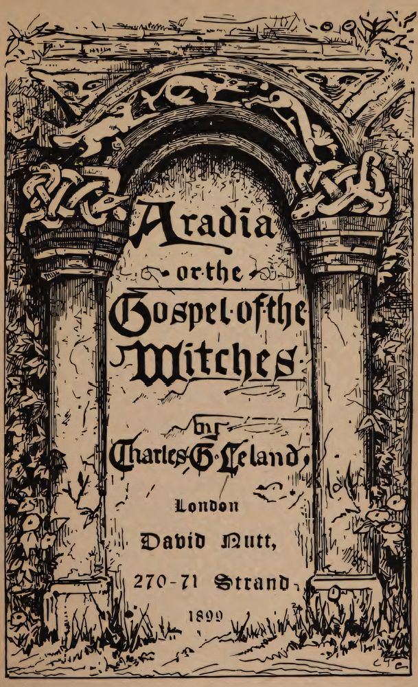 En bref je peux dire que l’art des sorcières est connu de ses adeptes comme la vecchia religione ou l’ancienne religion. Diane est leur déesse, sa fille Aradia (ou Herodias) le Messie féminin, dans ce qui suit on trouvera comment cette dernière est née et est venue sur Terre, comment elle a créé les sorcières et la sorcellerie, et est alors retournée au ciel. On trouvera aussi les cérémonies et les invocations ou les incantations à adresser à Diane et à Aradia, l’exorcisme de Caïn, et le sort de la pierre sainte, et de la rue et de la verveine, constituant, comme le dit le texte, le rite régulier, qui doit être chanté ou dit aux réunions de sorcières. On trouvera également d’étranges incantations ou les bénédictions du miel, de la farine, et du sel, ou les gâteaux du dîner sorcier, qui est très fortement influencé par l’antiquité et est une évidente relique des mystères romains. Le travail aurait pu se prolonger ad infinitum en y ajoutant des cérémonies et des incantations qui font réellement partie des rites sorciers, mais on les retrouve tous ou presque dans mes travaux intitulés Etruscan-Roman Remains et Legends of Florence, j’ai hésité à compiler un tel volume avant de m’assurer qu’il y avait un public assez nombreux intéressé par ce travail.