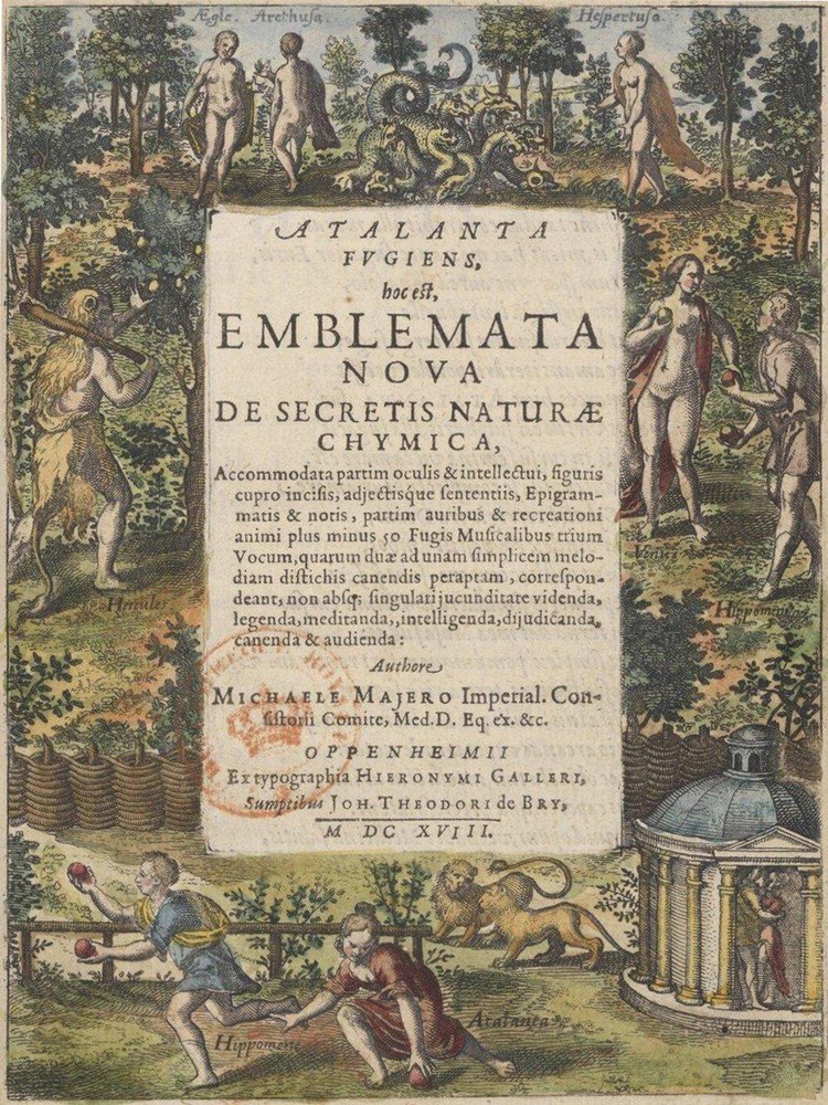 J’ajouterai quelques mots pour expliquer le titre de ces emblèmes, afin qu’il ne te semble pas étrange et peu adapté. Atalante a été célébrée par les poètes pour la fuite qui lui permettait de précéder tous ses prétendants à la course. Ainsi, à la place de la vierge, récompense promise de la victoire, les vaincus trouvaient la mort, jusqu’au jour ou Hippomène, jeune homme des plus audacieux et prévoyant, la vainquit et l’obtint en jetant dans sa course trois pommes d’or l’une après l’autre. Pendant qu’elle les ramassait, elle fut dépassée par lui, alors qu’elle allait atteindre le but. De même que cette Atalante fuit, une voix musicale fuit toujours devant l’autre, et cette autre la poursuit, comme Hippomène. Cependant elles sont stabilisées et consolidées dans la troisième qui est simple et d’une seule valeur, comme par une pomme d’or. Cette même vierge est purement chymique ; elle est le mercure philosophique fixé et retenu dans sa fuite par le soufre d’or. Si quelqu’un sait l’arrêter, il possédera l’épouse qu’il recherche, sinon, il trouvera la perte de ses biens et la mort. Hippomène et Atalante s’unissant d’amour dans le temple de la Mère des Dieux, qui est le vase, deviennent des lions, c’est-à-dire qu’ils acquièrent la couleur rouge. Cette vierge remporta encore la victoire devant des hommes lorsqu’elle tua un certain sanglier d’une grandeur prodigieuse et qu’elle reçut pour cela une récompense des mains de Méléagre. Auprès du temple d’Esculape à Stéthée, elle frappa un rocher et en fit jaillir de l’eau dont elle but, dans sa soif. Comme toutes ces choses sont en réalité allégoriques et emblématiques et nullement historiques, j’ai voulu consacrer ce traité emblématique en commémoration intellectuelle de cette héroïne, étant donné, en particulier, que les pommes jetées vers elle provenaient des jardins d’Hespérie et avaient été remises à Hippomène par Vénus, déesse de la suavité.