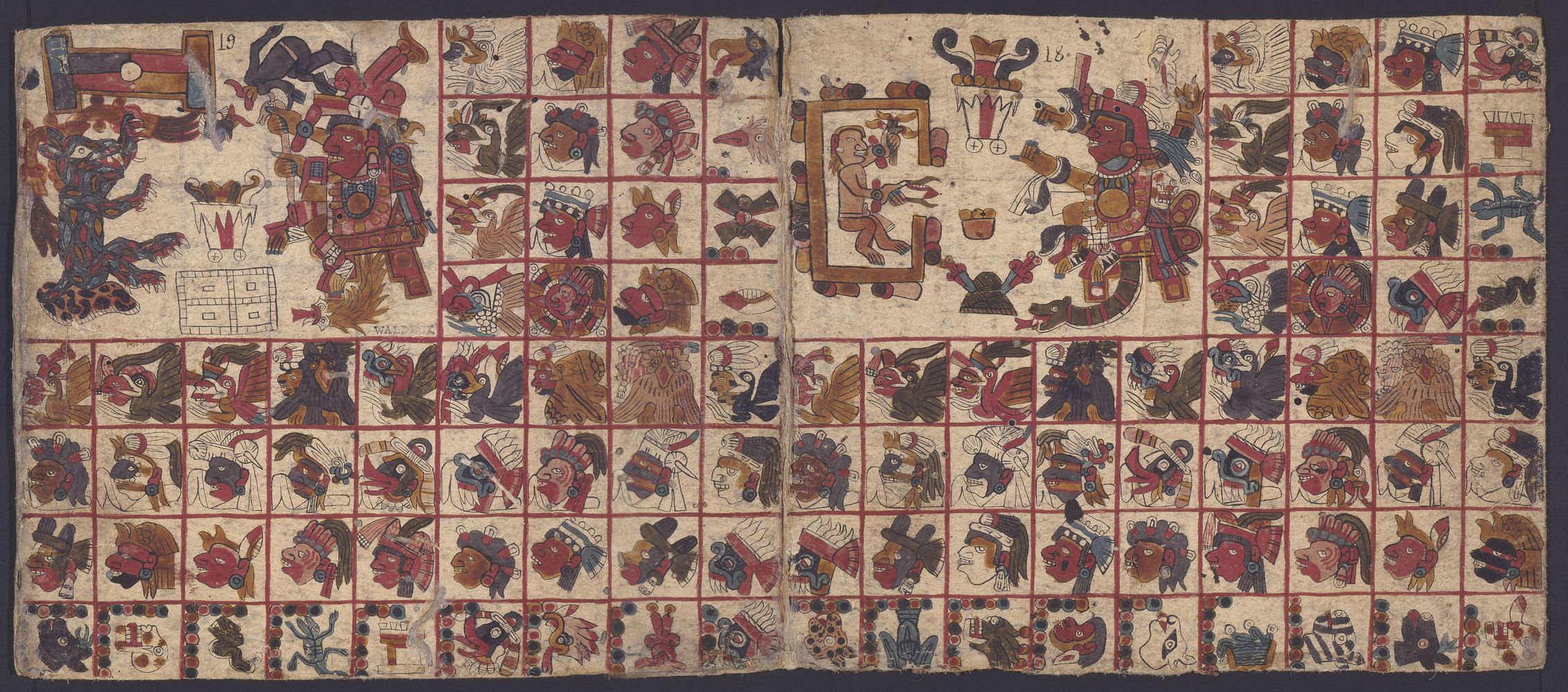 ► Ce tonalpohualli (calendrier religieux de 260 jours) auquel il manque vraisemblablement deux feuillets, est probablement originaire de la la région de l’État de Tlaxcala. Écrit en nahuatl, il se parcourt de haut en bas et de droite à gauche.