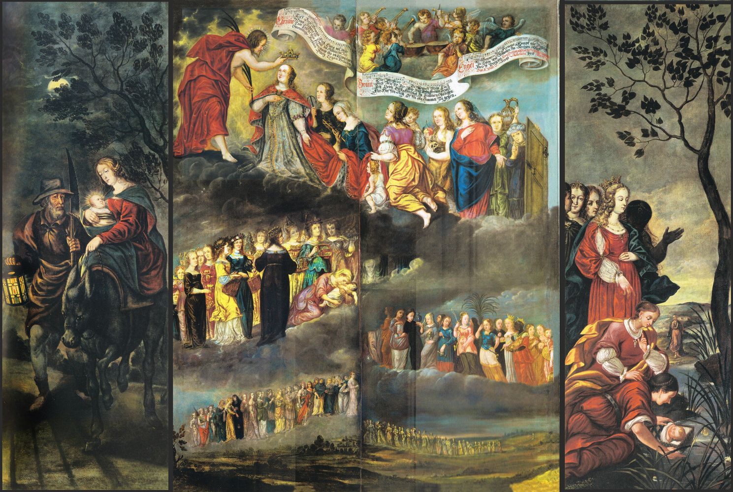 Commentaire : Fermés, les volets présentent une procession d’âmes (exclusivement féminines) aboutissant à un mariage mystique avec le Christ. Ouverts ils montrent la fuite d’Égypte de la Sainte Famille à gauche et la découverte de Moïse sur le Nil.