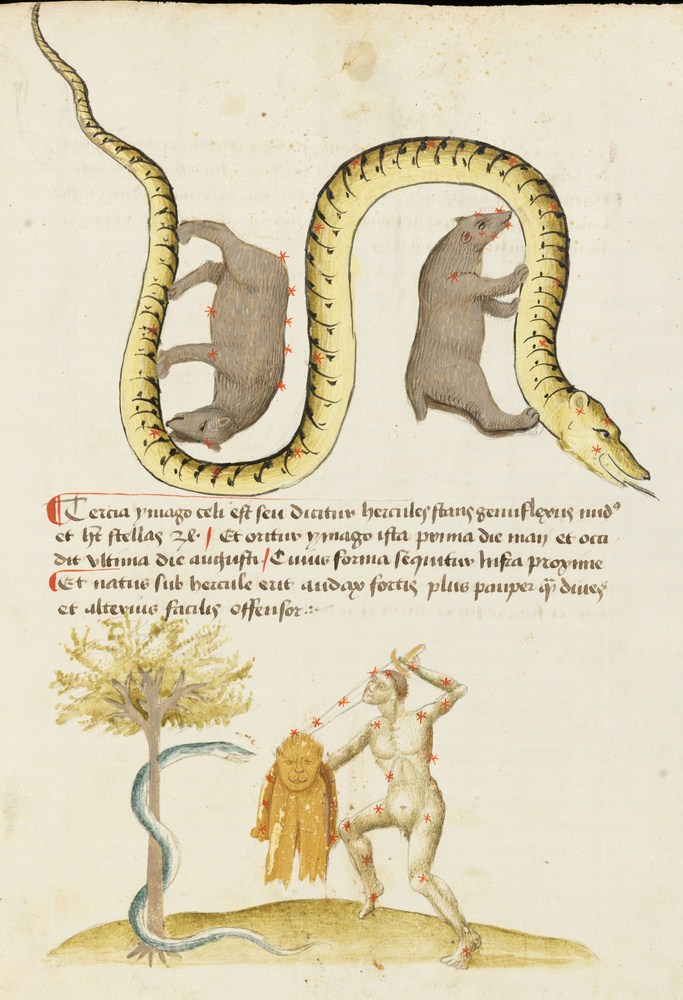 ■ Il manque la série du Lion et de la Vierge dans la présentation des décans de la version de la Bibliothèque cantonale de Saint-Gall. De plus les figures n’étant pas positionnées de la même manière que dans celle de la Bibliothèque nationale d’Espagne, nous n’avons pas pu les disposer dans une symétrie parfaite (sinon au prix d’un démembrement des pages, ce que nous avons voulu éviter).