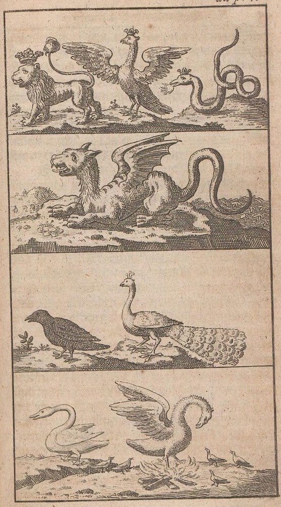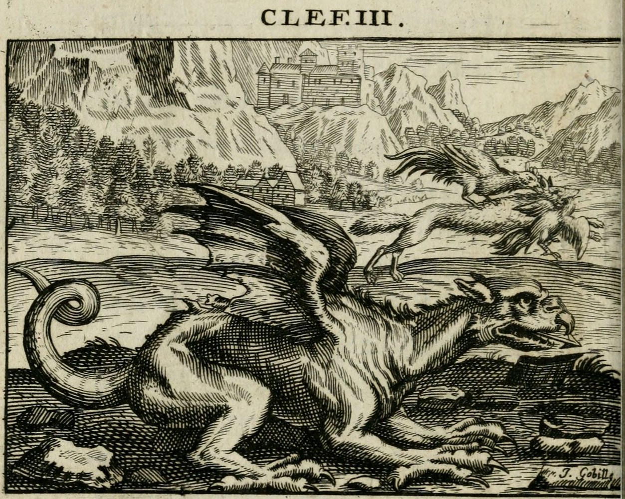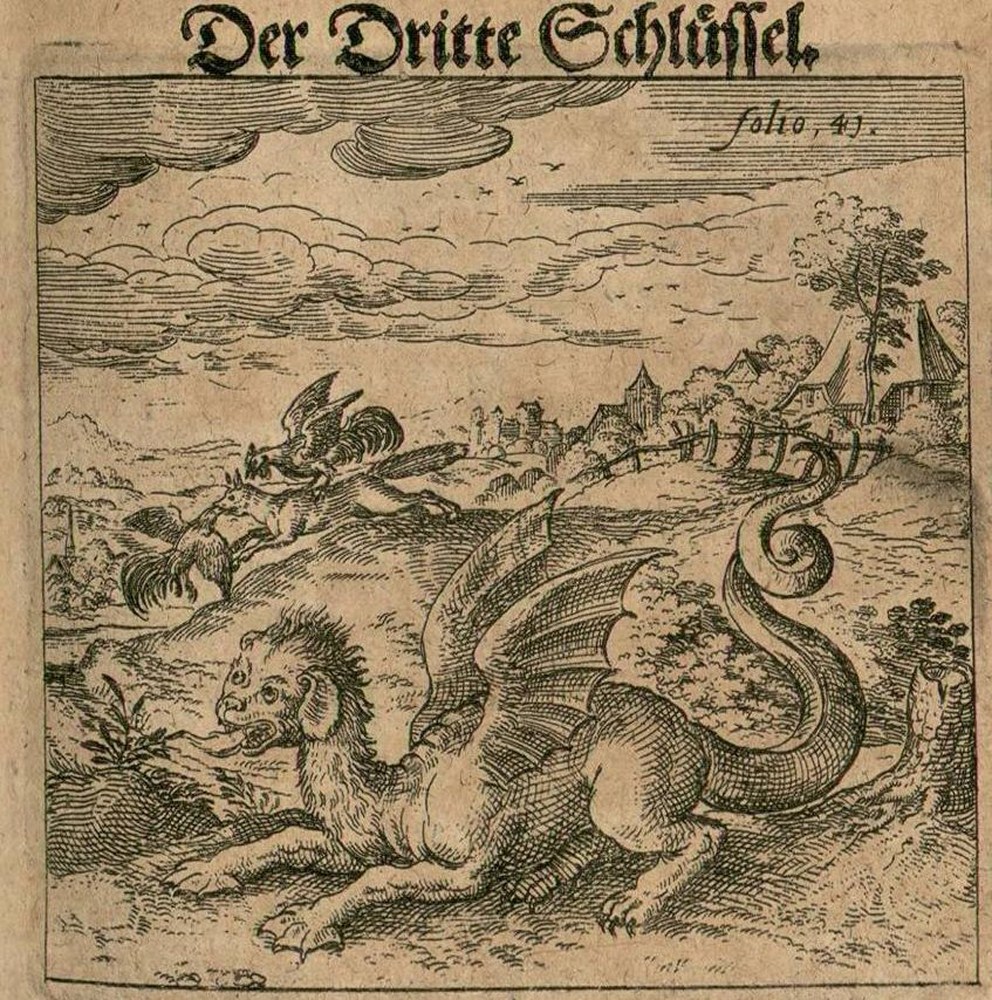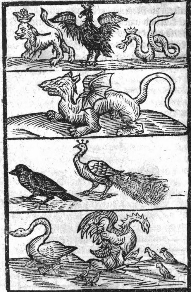 Un oiseau Méridional rapide et léger arrache le cœur du corps d’un grand animal d’Orient, l’ayant arraché le dévore, baille aussi des ailes à l’animal d’Orient afin qu’ils soient semblables, car il faut que l’on ôte à la bête Orientale sa peau de Lion, et que derechef ses ailes disparaissent, et qu’ils entrent dans la grande mer salée, et en sortent derechef ayant pareille beauté, alors jette ses esprits remuant dans un puits bien creux ou l’eau ne tarisse jamais afin qu’ils luis soient rendus semblables, comme leur mère qui y est cachée, et en a été composée, et pris sa naissance des trois.
