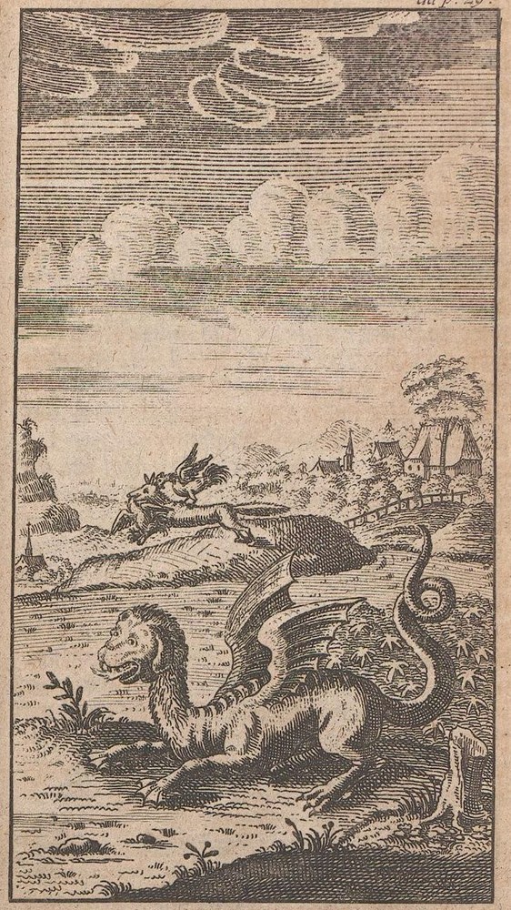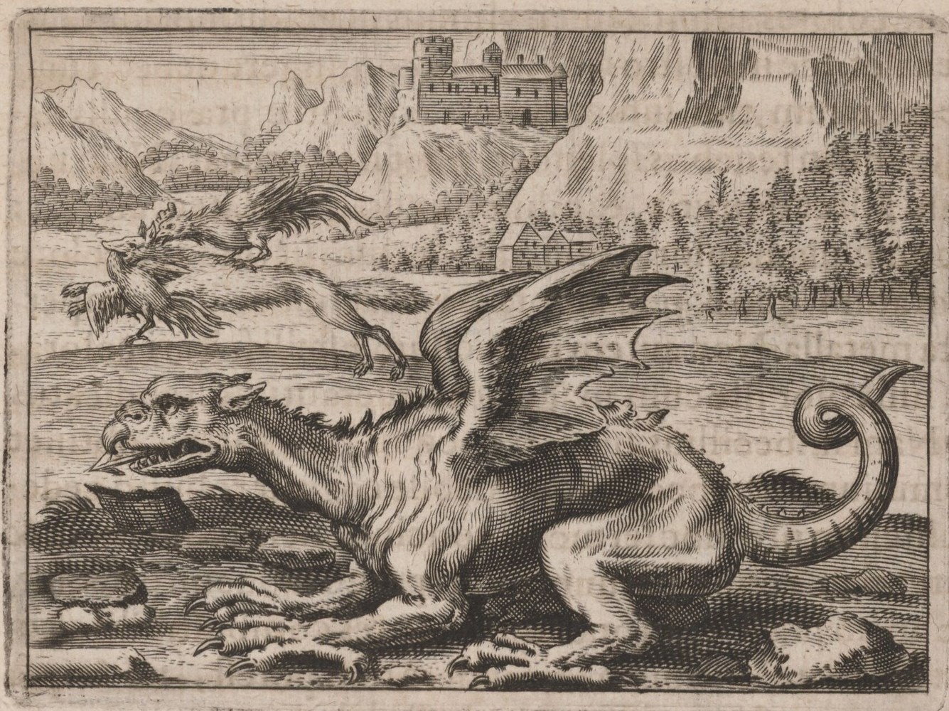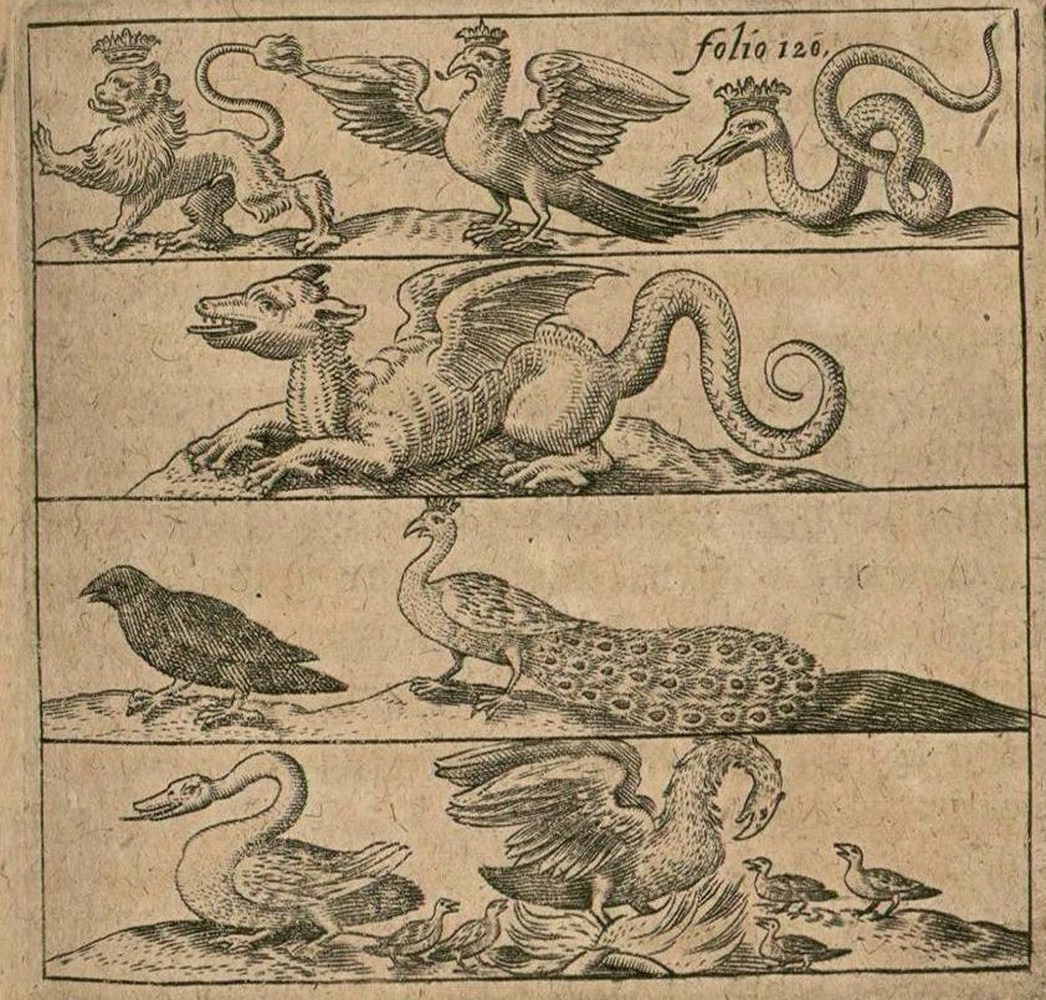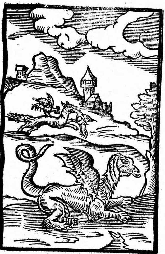 Un oiseau Méridional rapide et léger arrache le cœur du corps d’un grand animal d’Orient, l’ayant arraché le dévore, baille aussi des ailes à l’animal d’Orient afin qu’ils soient semblables, car il faut que l’on ôte à la bête Orientale sa peau de Lion, et que derechef ses ailes disparaissent, et qu’ils entrent dans la grande mer salée, et en sortent derechef ayant pareille beauté, alors jette ses esprits remuant dans un puits bien creux ou l’eau ne tarisse jamais afin qu’ils luis soient rendus semblables, comme leur mère qui y est cachée, et en a été composée, et pris sa naissance des trois.