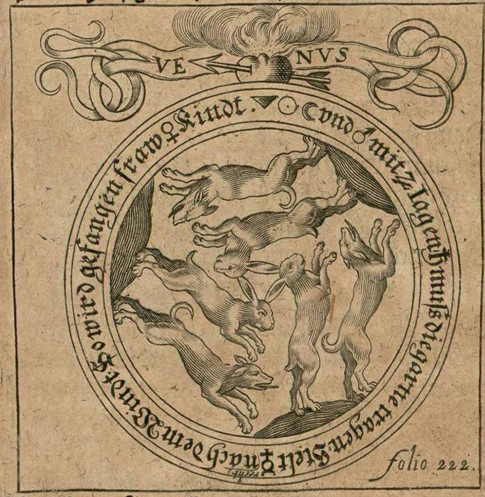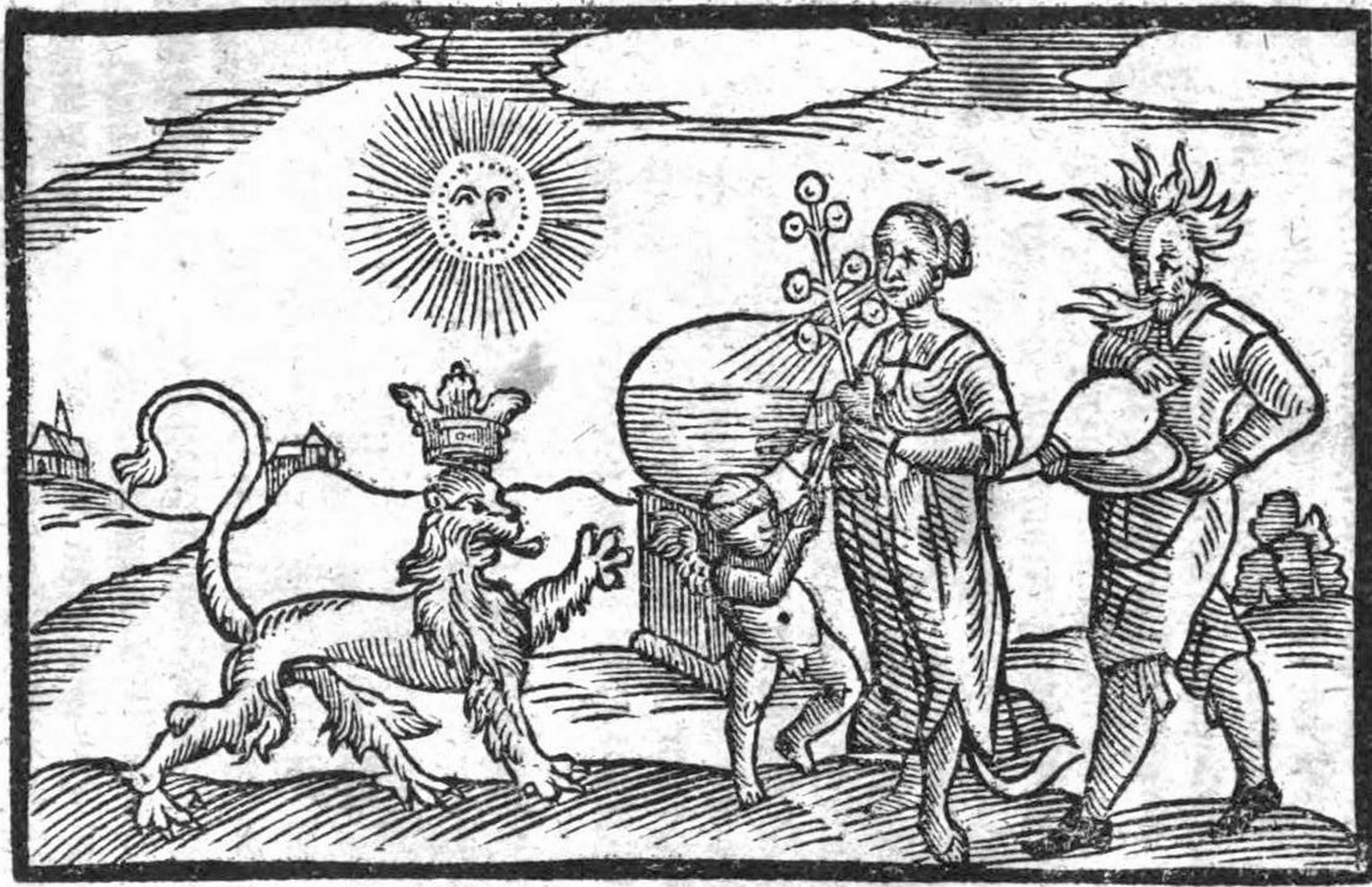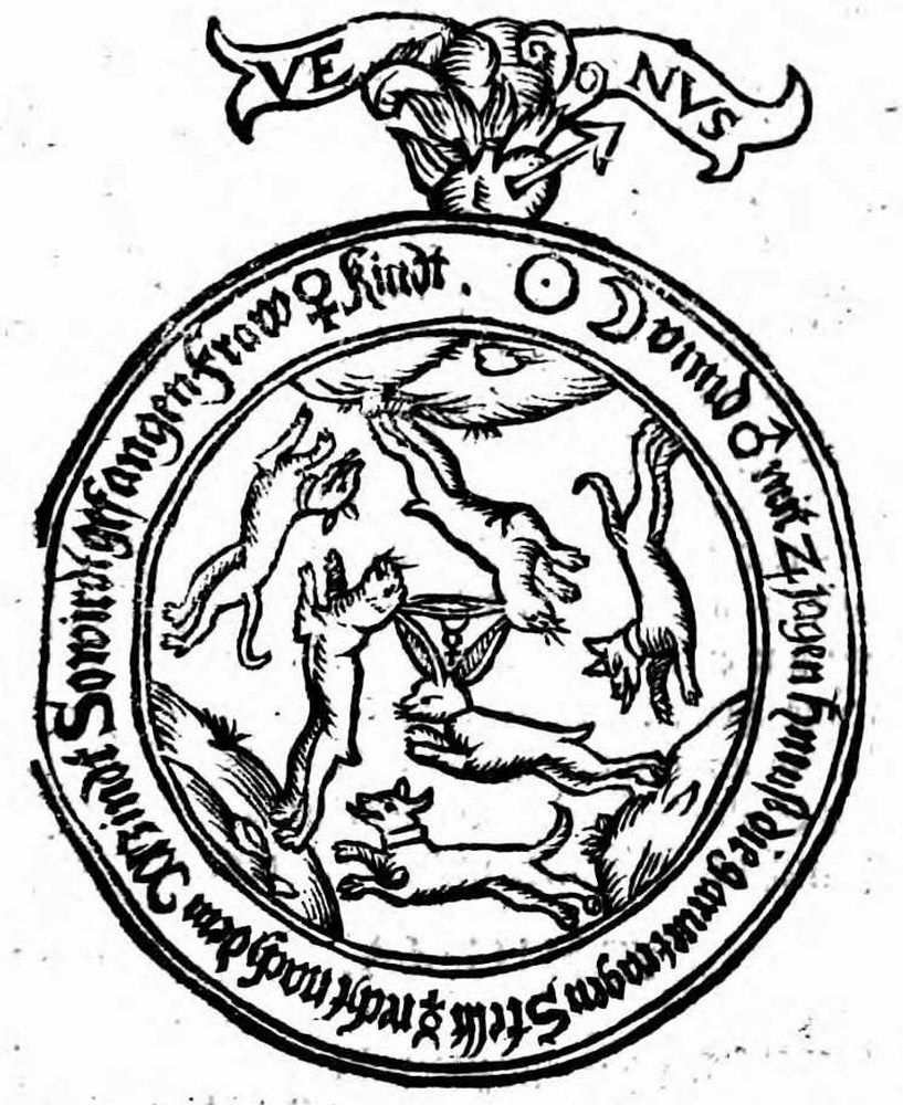 Comme ils parlaient ensemble, le Ciel s’ouvrit, et en sorti un grand animal avec, et un infinité de petits, lequel tua Vulcain, et à gueule ouverte dévora la noble Vénus qui priait pour lui, et cria à haute voix, les femmes m’ont engendré, les femmes ont semé et épars par toute semence et ont rempli le monde, et leur âme est unie avec moi, c’est pourquoi aussi vivrai de leur sang, ayant dit cela à haute voix, il se retire, accompagné de tous ses petits en une chambre, ferma la porte, et mangea bien d’avantage que de coutume, bu sa première incombustible, et digéra bien plus aisément son boire et manger, et créa beaucoup de nombre infini de ses petits, et cela se fit tant de fois que tout le monde en fut rempli.