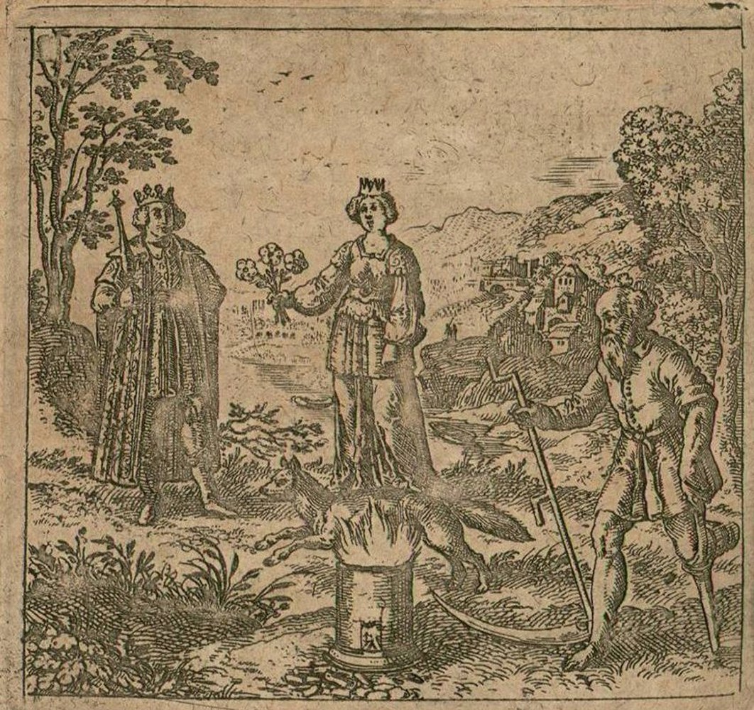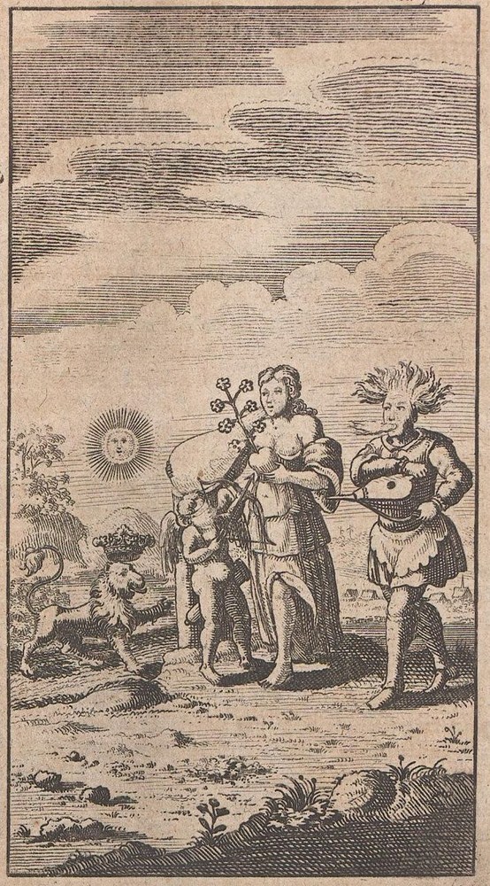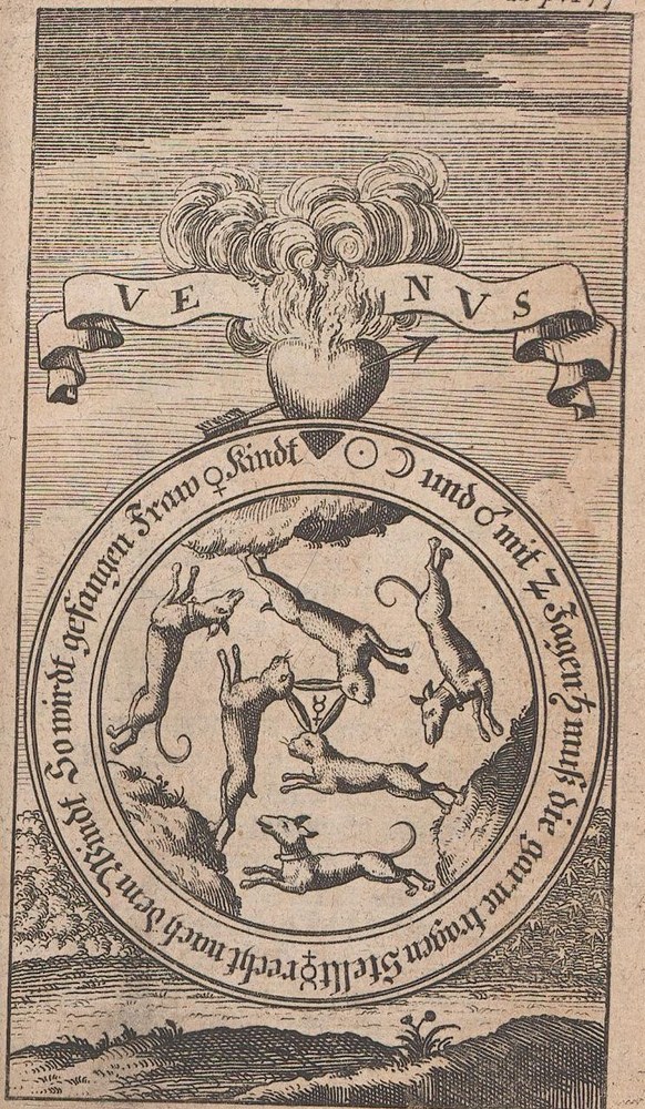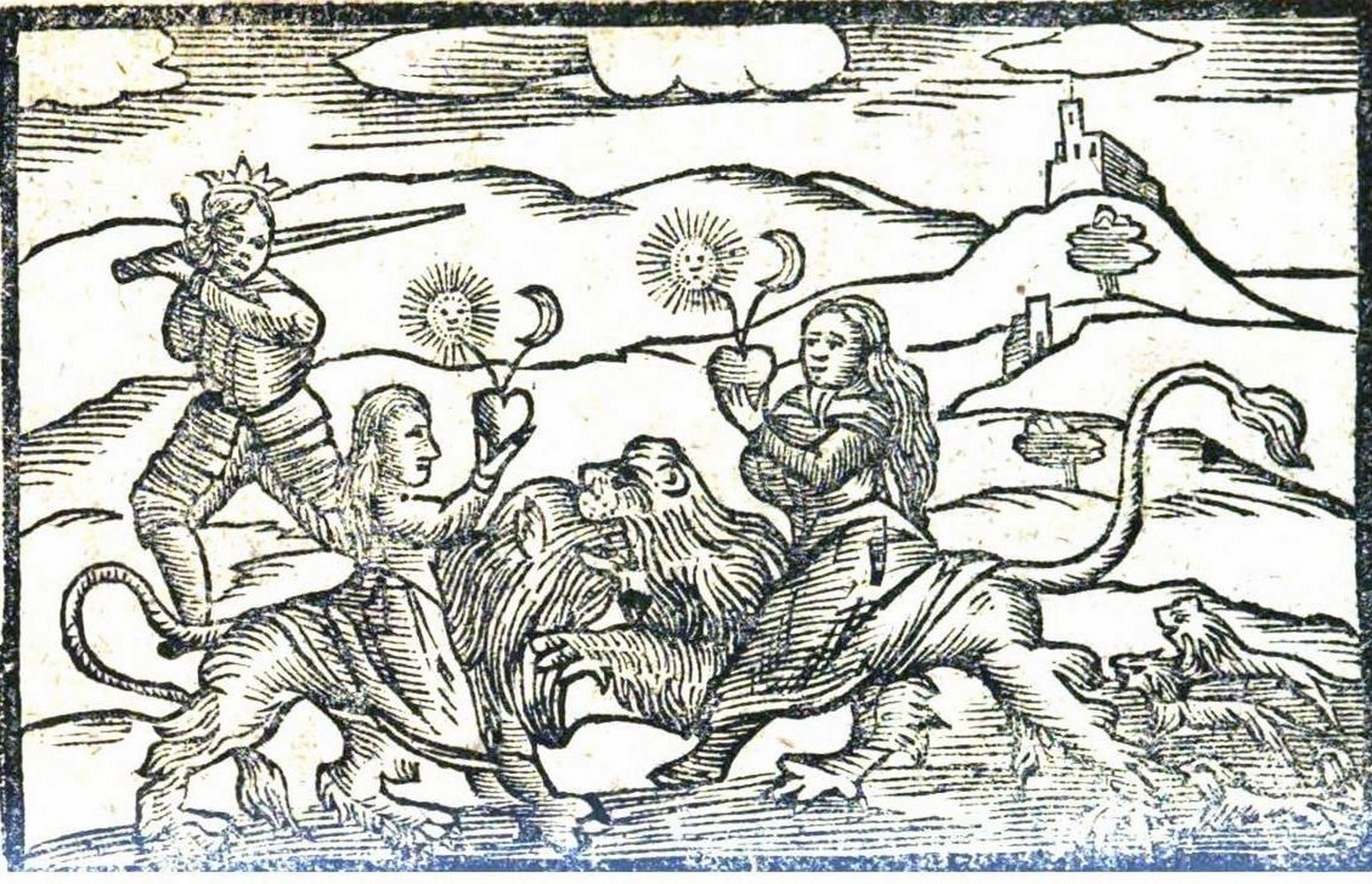 Comme ils parlaient ensemble, le Ciel s’ouvrit, et en sorti un grand animal avec, et un infinité de petits, lequel tua Vulcain, et à gueule ouverte dévora la noble Vénus qui priait pour lui, et cria à haute voix, les femmes m’ont engendré, les femmes ont semé et épars par toute semence et ont rempli le monde, et leur âme est unie avec moi, c’est pourquoi aussi vivrai de leur sang, ayant dit cela à haute voix, il se retire, accompagné de tous ses petits en une chambre, ferma la porte, et mangea bien d’avantage que de coutume, bu sa première incombustible, et digéra bien plus aisément son boire et manger, et créa beaucoup de nombre infini de ses petits, et cela se fit tant de fois que tout le monde en fut rempli.