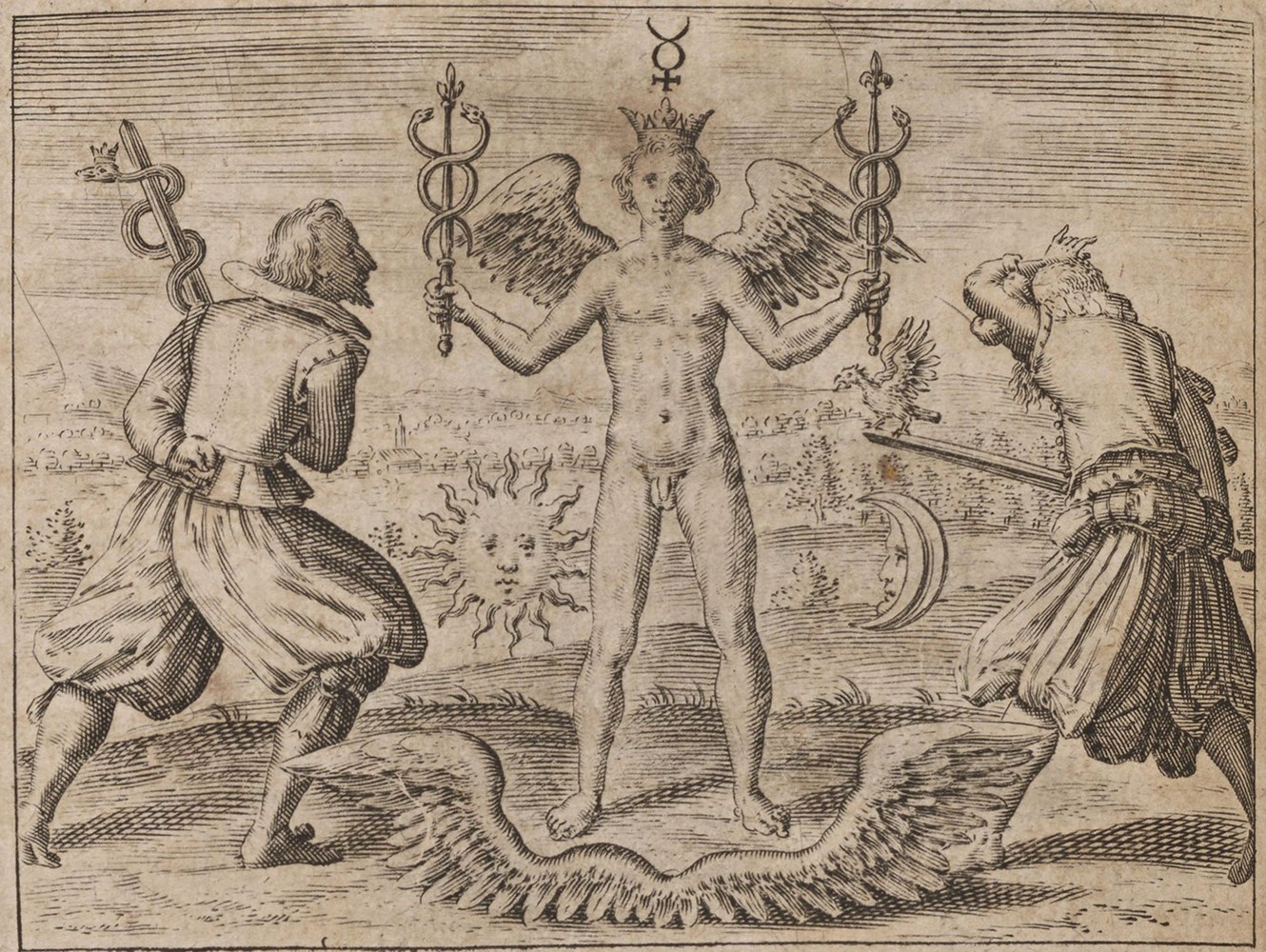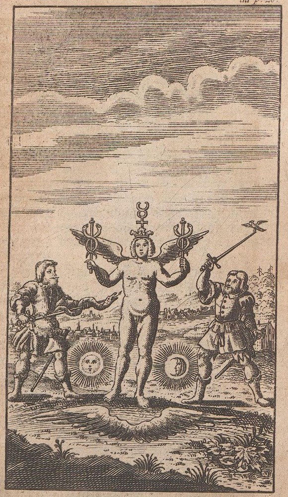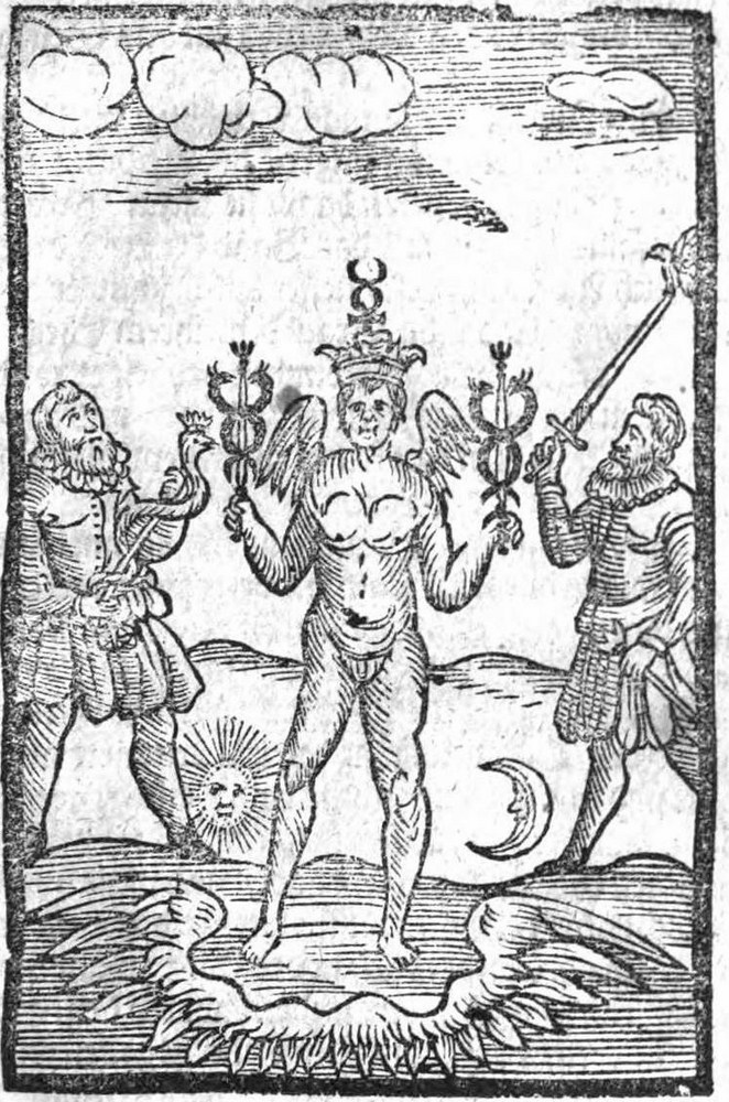 L’on mena cette eau au Dieu Mercure son père, pour être examinée, et la voulut épouser, et de fait l’épousa, et se fit d’eux une huile incombustible, puis Mercure devint si orgueilleux et superbe, qu’il ne se reconnu plus pour soi même, mais ayant jeté ses ailes d’Aigle, il dévora sa queue glissante d’un dragon, et déclara la guerre à Mars, incontinent Mars ayant assemblé sa compagnie de chevaux légers, fit prendre Mercure, le mit prisonnier, et constitua Vulcain pour Geôlier de sa prison, jusqu’à c qu’il fut derechef délivré par le sexe féminin.