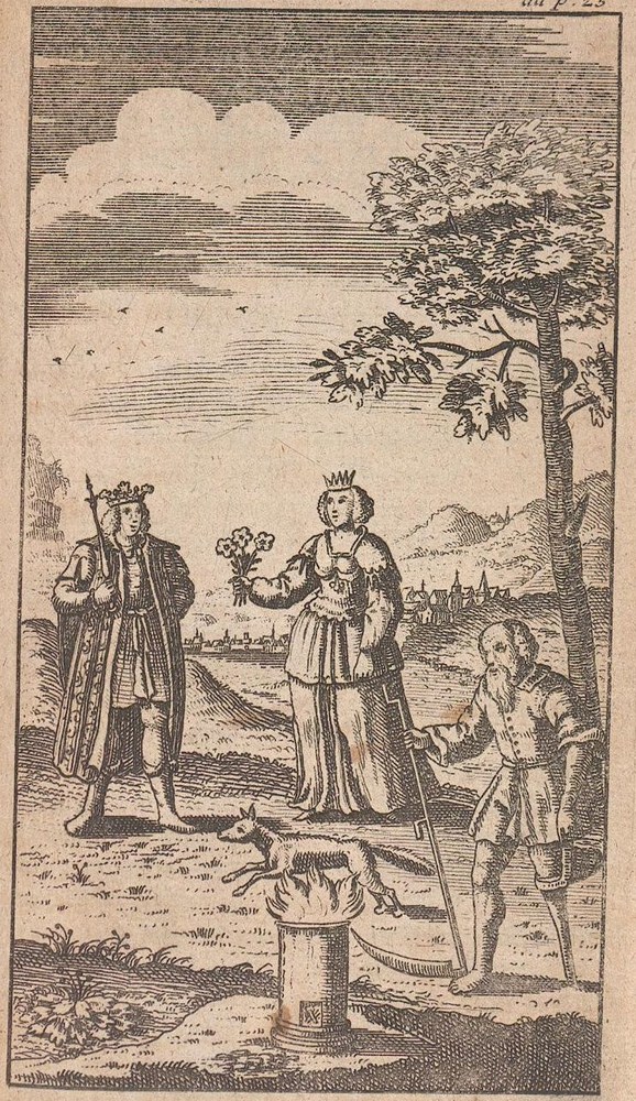 Tout ceci s’étant passé de la façon, plusieurs doctes gens du pays s’assemblèrent, et se mirent ensembles à chercher le moyen de connaître ce mystère, pour avoir plus parfaite connaissance de ce fait, mais ne s’accordant point ensemble, ils se travaillaient pour néant, jusqu’à ce qu’on vit venir un vieillard qui avait la barbe et les cheveux aussi blancs que neige, il était vêtu d’écarlate depuis les pieds jusqu’à la tête, avec une couronne d’or entrelacée de pierres précieuses de grande valeur. En outre il était ceint d’une ceinture de toute gloire et bonheur, et marchant nus pieds, il parlait par un singulier esprit qui était en lui, ses paroles pénétrèrent tout son corps et de telle façon que son Ame s’en sentait, cet homme s’élevait un peu plus haut que les autres, et il fallait faire silence aux assistants, et parce qu’il était envoyé du Ciel pour déclarer et expliquer par discours physique la susdite parabole et énigme, il les admonesta de prêter les oreilles ouvertes, et l’écouter patiemment.