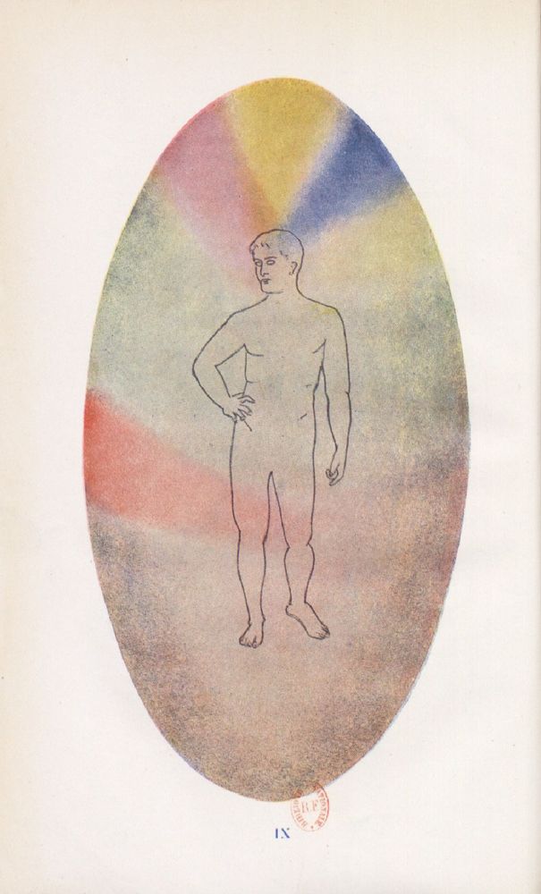 Note du traducteur: Le rendement des illustrations de cet ouvrage, par la photochromogravure, n’a pas donné tout ce que l’auteur en attendait. Pour ceux qui ont eu la bonne fortune d’examiner les illustrations originales, il semble, de prime-abord, que la reproduction en a accentué les oppositions et les contours et atténué par contre le fondu et ce quelque chose de vivant qui caractérisait les originaux. Cet ouvrage n’en présente pas moins un intérêt capital, car c’est le premier qui nous permette, avec l’aide de nos sens limités, de nous faire une idée approximative des véhicules subtils de l’âme tels qu’ils peuvent être observés par un clairvoyant exercé.