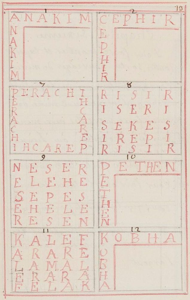 ► L’ouvrage se destine finalement à soumettre des démons. Il transmet ensuite nombre de carrés magiques palindromiques afin d’obtenir l’assistance des hiérarchies infernales ; ces carrés correspondant aux différentes choses que l’on peut demander aux esprits. Pour cette raison l’ouvrage a une réputation ambivalente : tantôt classé en théurgie, tantôt considéré comme un ouvrage crypto-goétique. L’auteur insiste auprès celui qui se destine à pratiquer le rituel : qu’il suive scrupuleusement ses instructions durant les six lunaisons que doit durer l’opération, notamment dans la relation qu’il établira avec les entités angéliques et démoniaques.