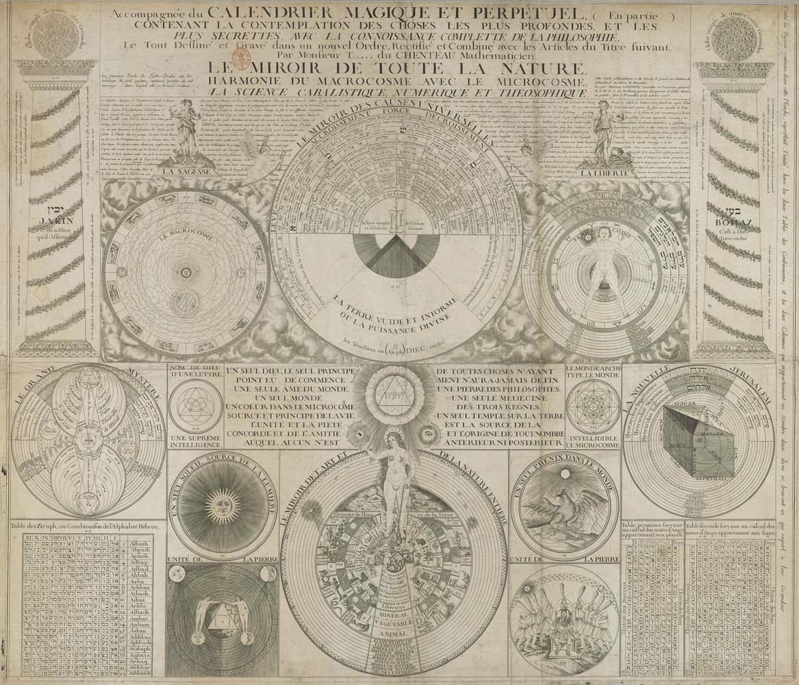 | James Bonaventure Hepburn (Vierge d’or) Johann Baptist Grosschedel von Aicha (Calendrier) grav. Théodore de Bry (Calendrier) Touzay Duchanteau (Carte Philosophique) | publ. 1616 (Vierge d’or) 1582, publ. 1620 (Calendrier) publ. 1775 (Carte Philosophique) | Gravures | publ. Rome (Italie) (Vierge d’or) publ. ℙ Allemagne (Calendrier) publ. Bruxelles (Belgique) (Carte Philosophique) | Magie Théosophie | ☄ ☩ |