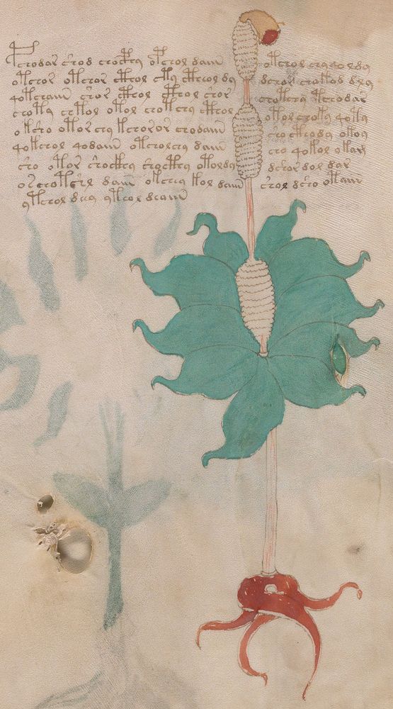 ► Le ms., qui est passé entre les mains de Dee, Rodolph II et Kircher, présente des illustrations de plantes, dont une bonne part son inconnues ainsi que des figurations astrologiques, cosmologiques et vraisemblablement alchimiques voir magiques. Certains chercheurs ont proposé que les deux derniers chapitres pourraient se référer à de la biologie ou de la balnéothérapie ainsi qu’a des recettes phytothérapiques sinon de cuisine…