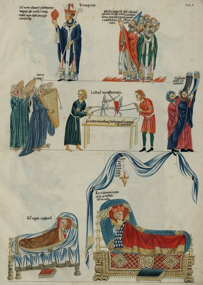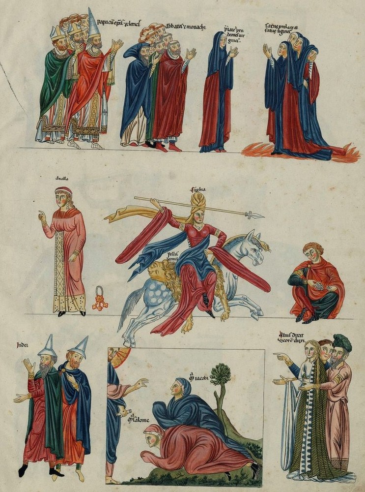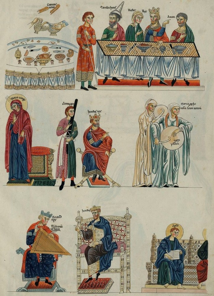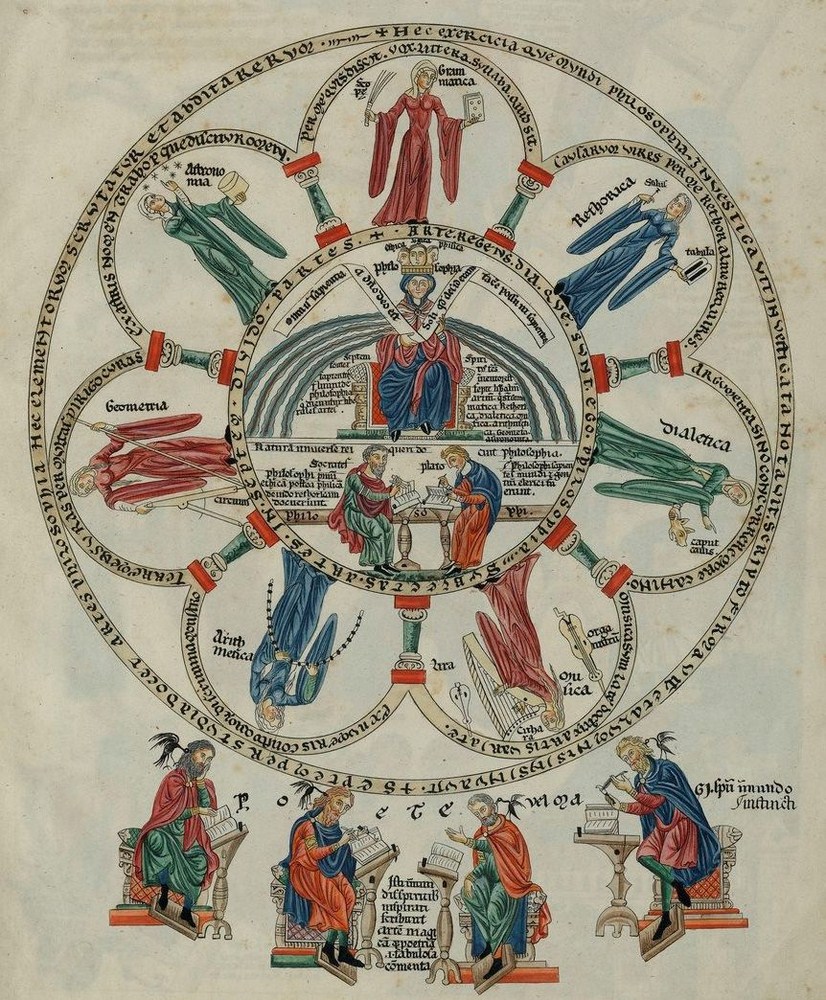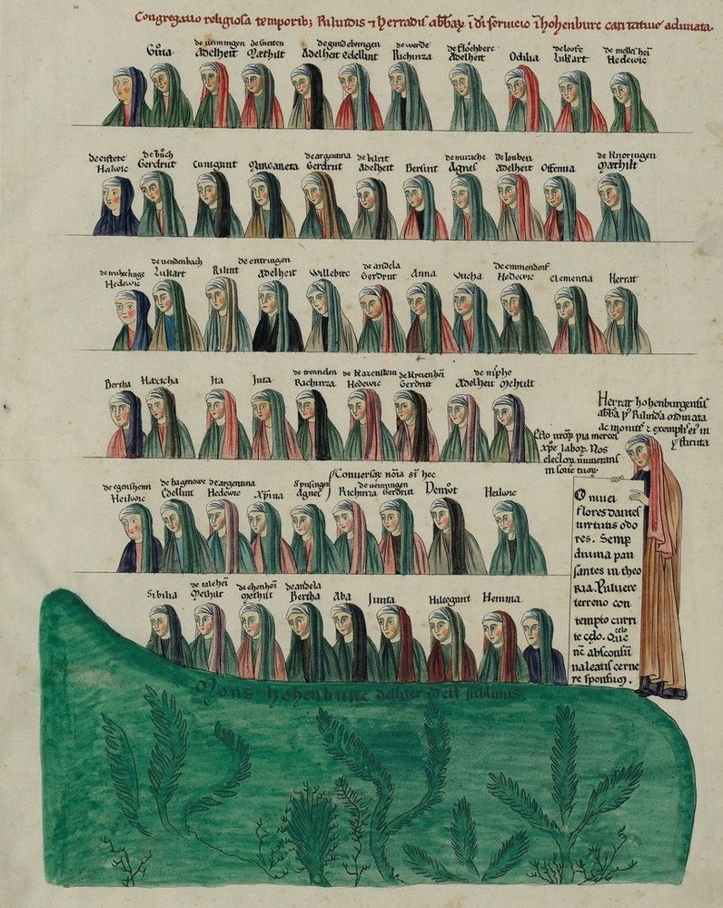 1167 – 1195 : Herrade de Landsberg et ses moniales écrivent le Jardin des délices 🗎⮵, cette encyclopédie inspirée du Livre fleuri pourvu de riches illustrations est la première qui fut réalisée par une femme. On perdit l’original en 1870 dans l’incendie de la Bibliothèque de Strasbourg et ne subsiste aujourd’hui que des copies fragmentaires dont les illustrations furent pour la majorité calquées au XIX par Maurice Engelhardt.