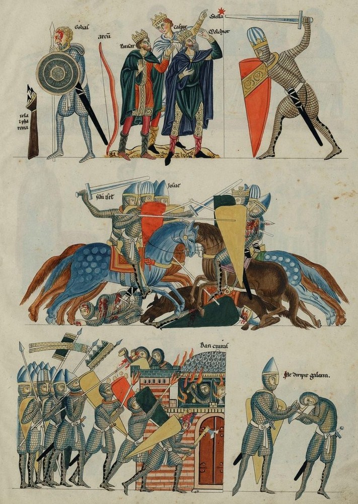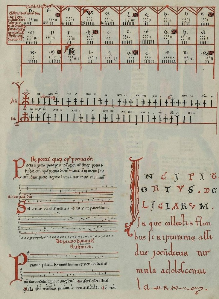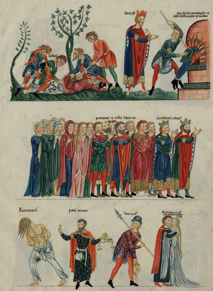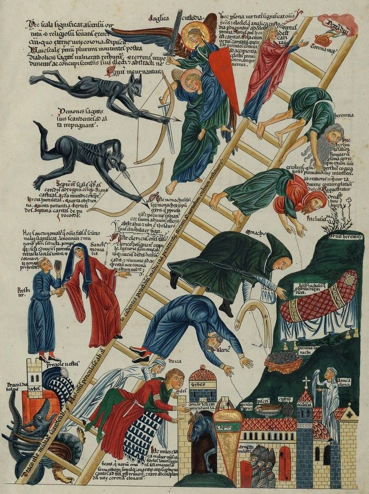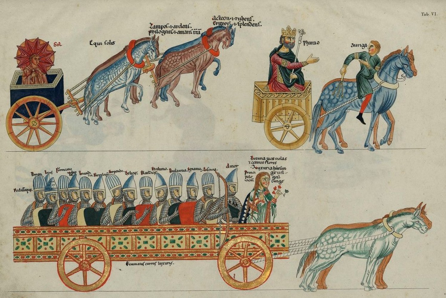 1167 – 1195 : Herrade de Landsberg et ses moniales écrivent le Jardin des délices 🗎⮵, cette encyclopédie inspirée du Livre fleuri pourvu de riches illustrations est la première qui fut réalisée par une femme. On perdit l’original en 1870 dans l’incendie de la Bibliothèque de Strasbourg et ne subsiste aujourd’hui que des copies fragmentaires dont les illustrations furent pour la majorité calquées au XIX par Maurice Engelhardt.