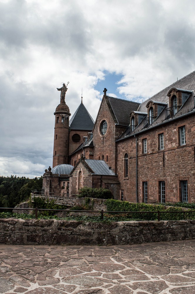 Statue de Saint-Odile de 1923-1924 réalisée par Alfred Klem. Présente sur le toit de la tourelle panoramique, elle est tournée du coté de l’Alsace.