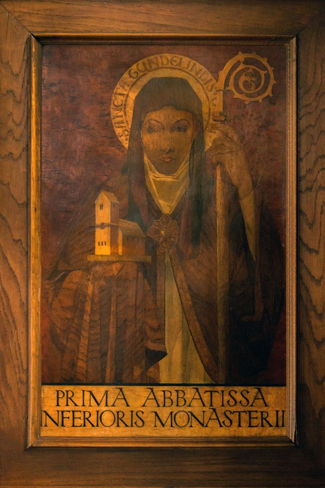 1153 : L’abbaye est brûlée par Frédéric II de Souabe en 1115. En 1153, L’abbesse Relinde mandatée par Frédéric Barberousse, fils du précédent, introduit dans l’édifice la règle de Saint-Augustin et projette des travaux de reconstruction et d’agrandissement en fondant notamment la Chapelle des Larmes 🗎⮵ et de la Chapelle des Anges 🗎⮵.