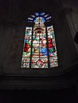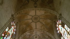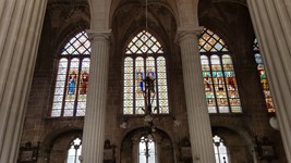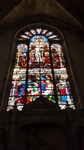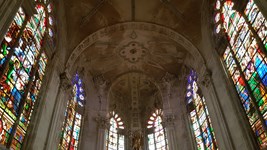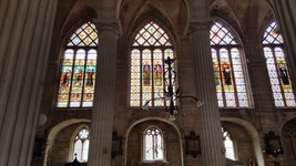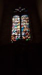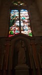 Vitraux de l’abbatiale représentant la vie du Christ, une Immaculée Conception surplombant une Vierge à l’enfant et une Mort de saint Joseph, surpombant une statue du même saint.