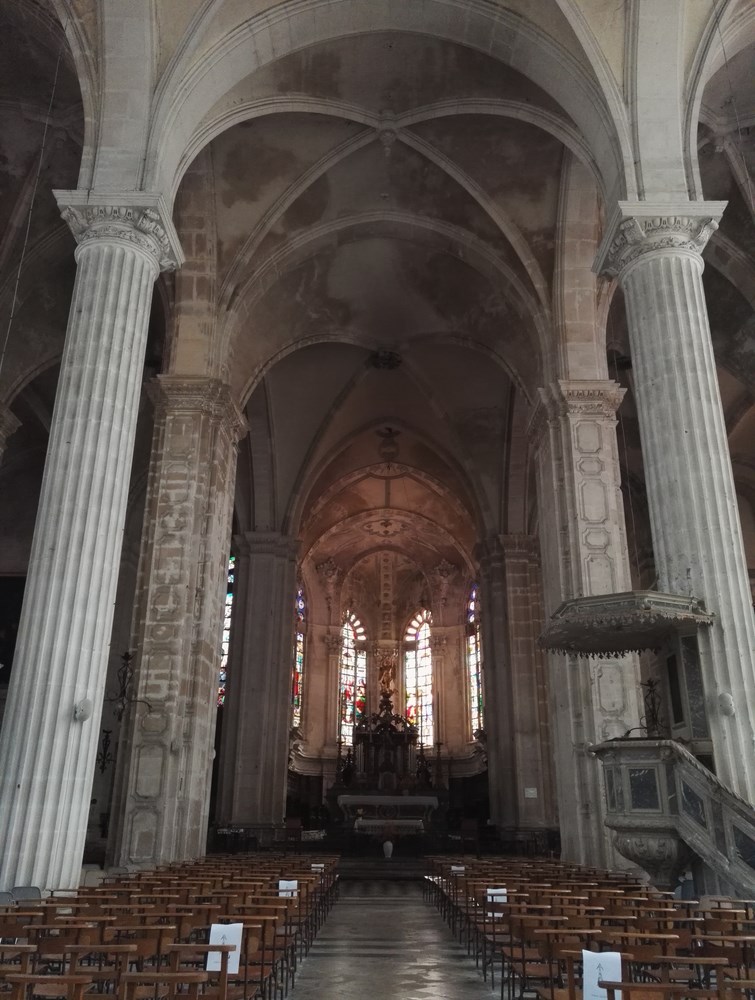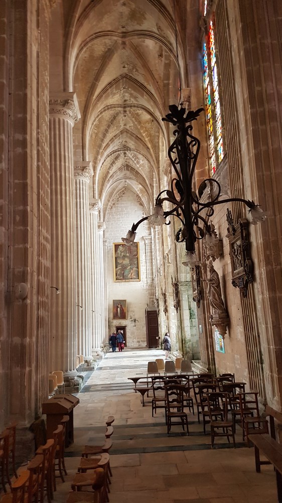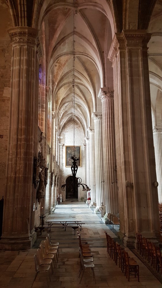 XIV – XVII : Construction des chapelles latérales. Au XVI, comme sa flèche s’écroule en 1550, on reconstruit l’étage supérieur de la tour-porche et de l’intégralité de la nef dans le style bénédictin de l’époque.