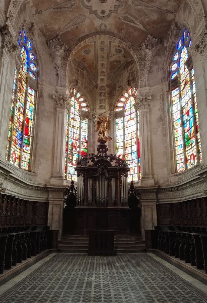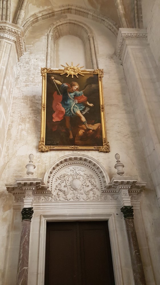 Profonde abside፧ dans laquelle on trouve des stalles de 1710 et un orgue de 1898 porté par un buffet art nouveau et surmonté d’une statue de Saint-michel à qui est dédié l’édifice.