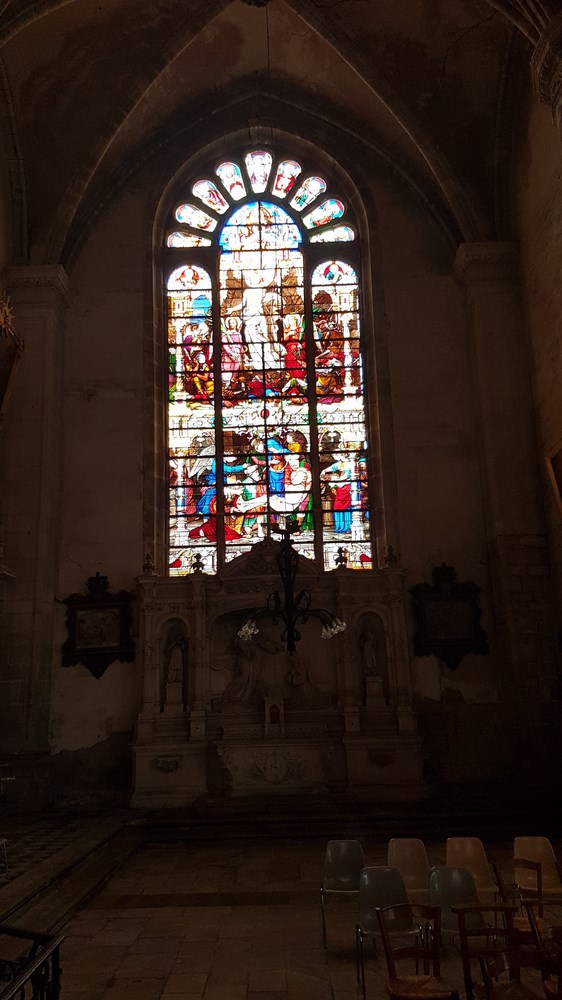 Vitrail figurant la Descente de croix et la Résurrection du Christ, au premier plan, un retable en calcaire du m.XIX figurant l’apparition du Sacré Coeur à sainte Marguerite Marie Alacocque.