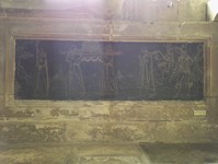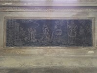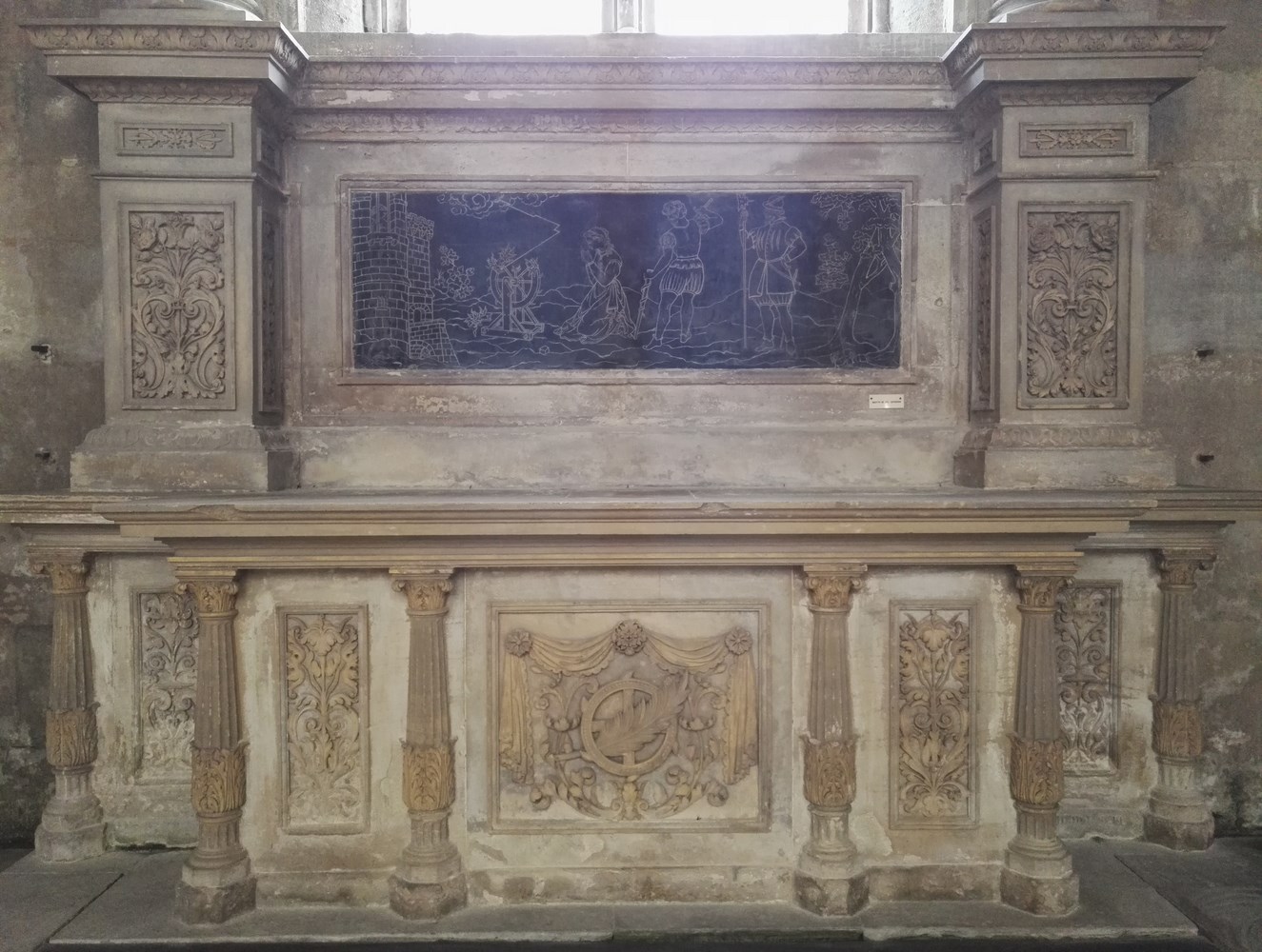 Autel en pierre orné d’une scène figurant le martyr de sainte-Catherine.